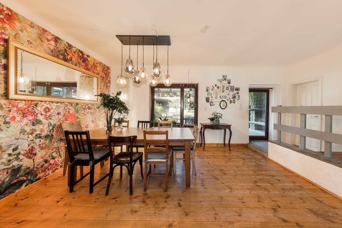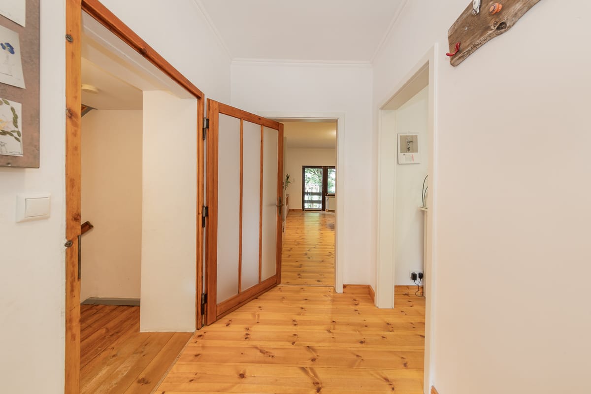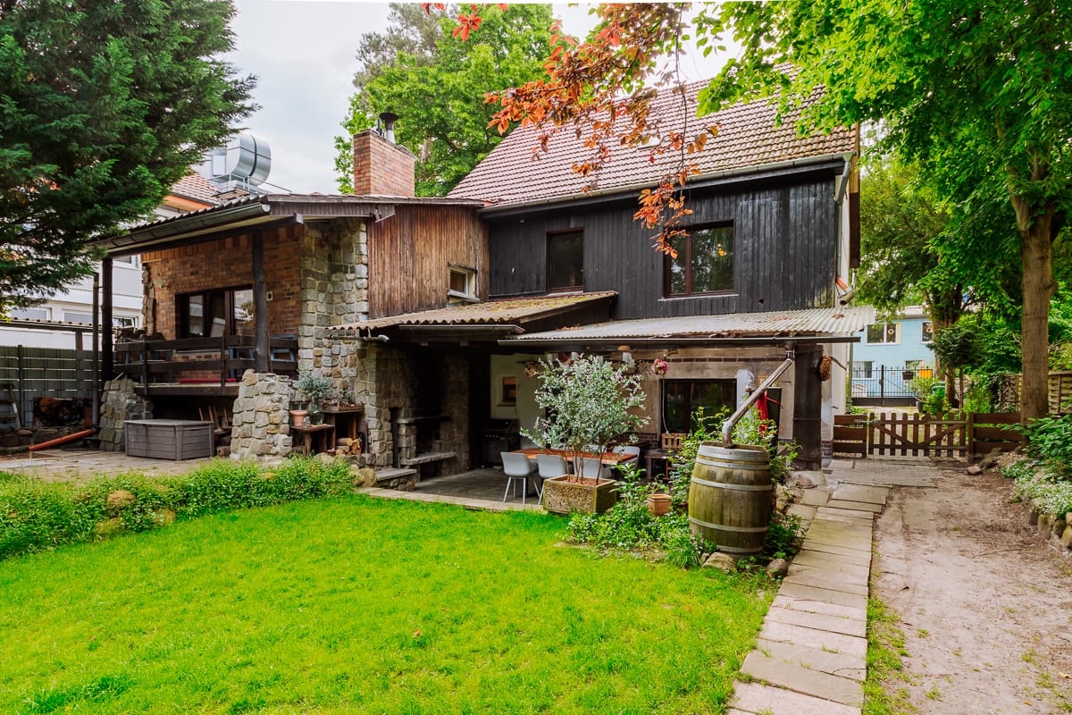 Ein Schwimmbad, ein Balkon und zwei Terrassen – eine davon überdacht und mit Außenkamin – sorgen für absolute Entspannung. Im Gewächshaus und auf den Beeten wächst Ihr selbst gepflanztes Gemüse. Das Anwesen befindet sich mitten in Eichwalde. Alle wichtigen Orte des Familienlebens sind innerhalb von rund 15 Minuten zu erreichen.