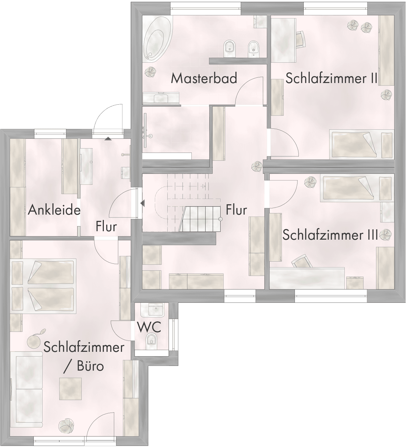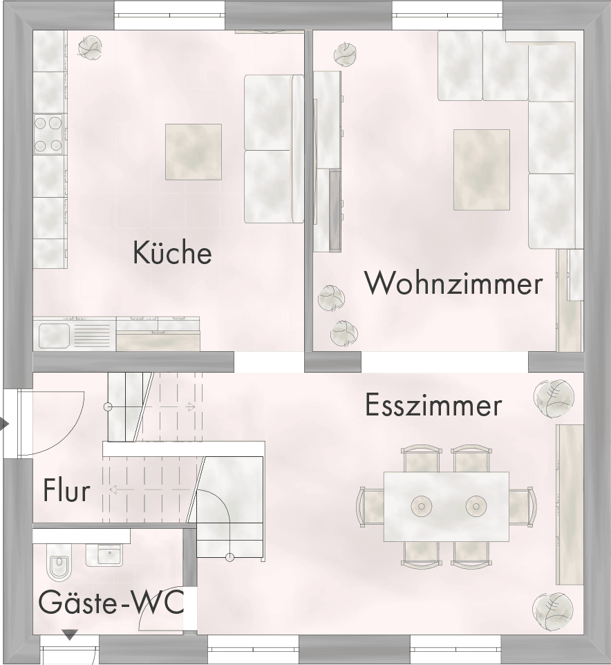 Das Erdgeschoss schafft durch große Fenster und die verglaste Terrassentür eine enge Verbindung zum angrenzenden, weitläufigen Garten und zeigt sich hell und freundlich. Durch die ideale Aufteilung der Räume, nutzen Sie das Erdgeschoss als Treffpunkt für Familie und Freunde. Über 50,00 m² Fläche kommen hier ohne Türen aus – in dem loftartigen Raum sind Wohnzimmer, Esszimmer und Küche zu einem fantastischen Wohnerlebnis vereint. Das Obergeschoss dient als Rückzugsetage, in der jedes Familienmitglied die Privatsphäre eines eigenen Zimmers genießt. Das Dachgeschoss lässt sich ganz nach Ihren individuellen Wünschen und Vorlieben ausbauen und ausstatten.