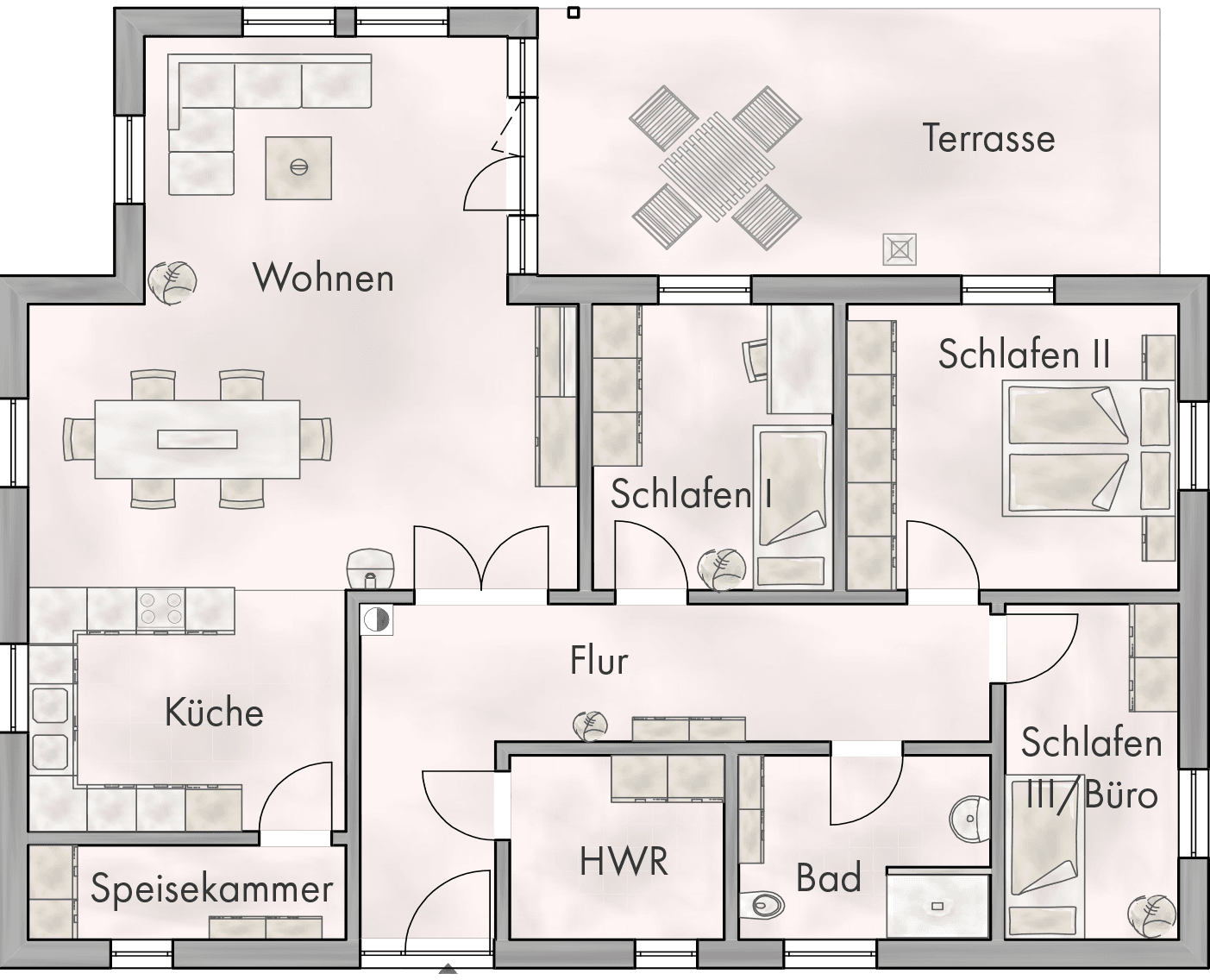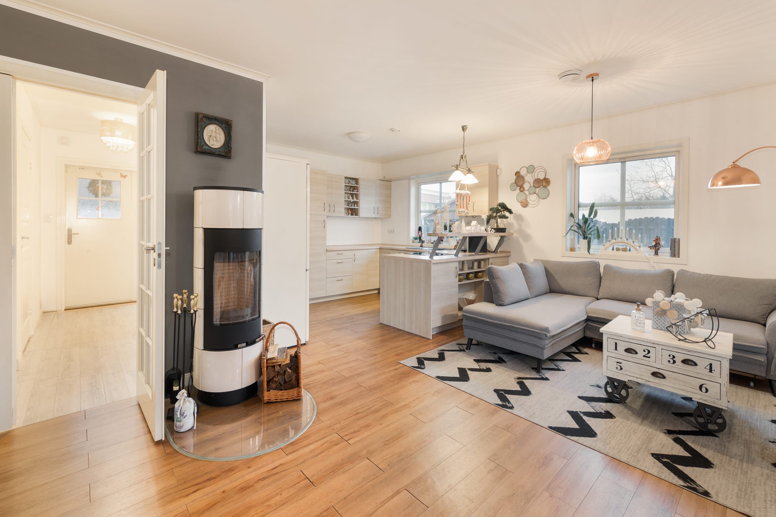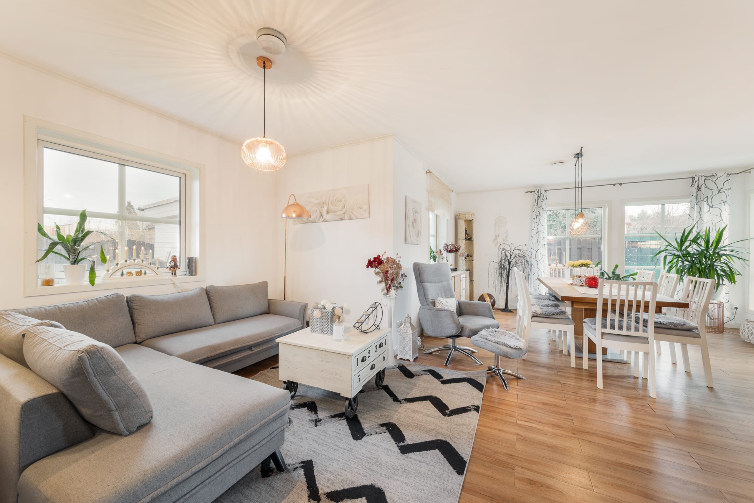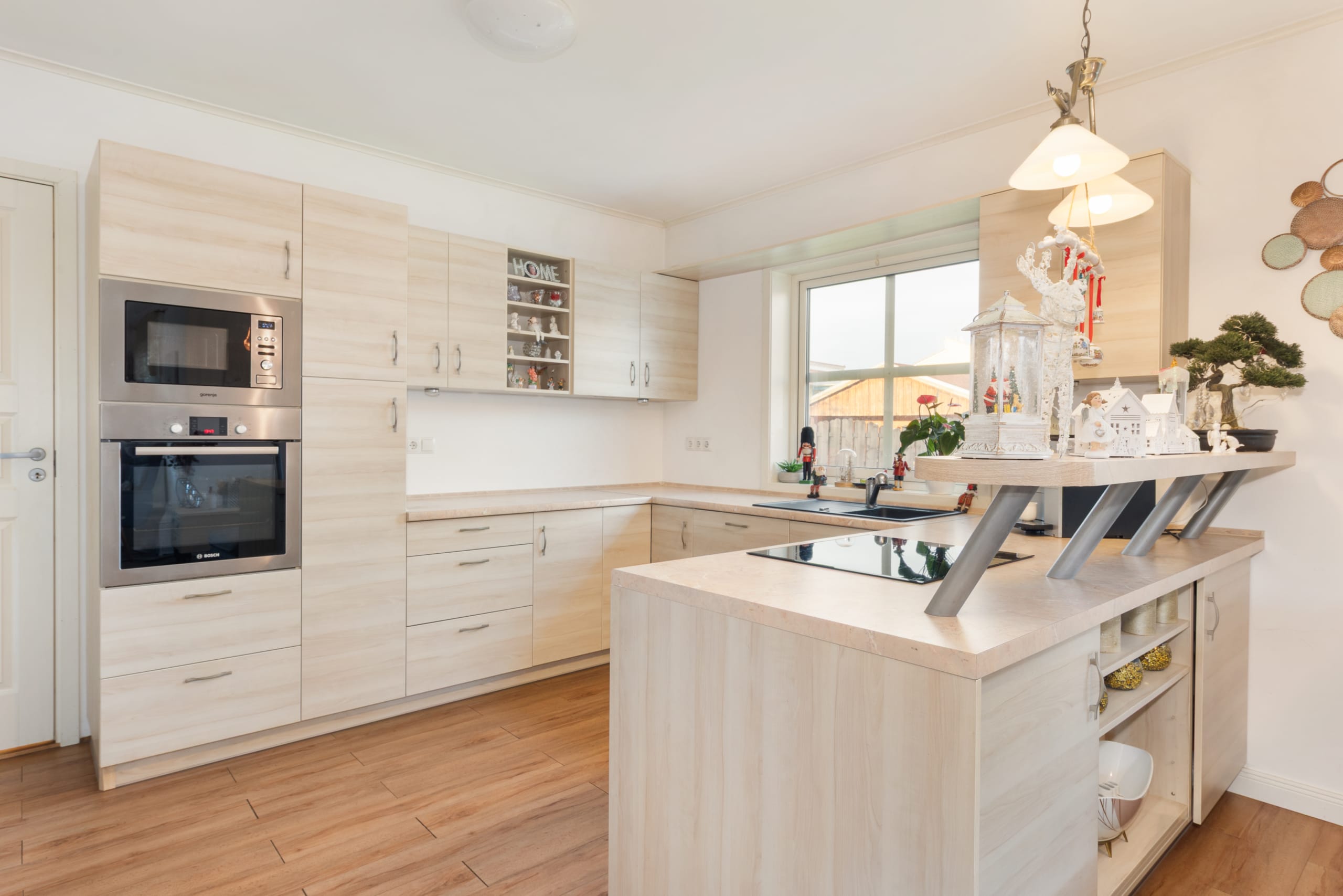 So ist Ihr zukünftiges Zuhause bspw. mit energieeffizienter Haustechnik ausgestattet. Dazu gehören die Fußbodenheizung mit Einzelraumsteuerung, eine Photovoltaik-Anlage mit Stromspeicher, eine Belüftungsanlage mit Wärmerückgewinnung und doppelt verglaste Fenster. Einzig die moderne Gasbrennwerttherme mit Solarkollektoren könnte perspektivisch durch eine Wärmepumpe ersetzt werden. Darüber hinaus begeistert der Bungalow mit Stilelementen wie Kassettentüren, verspielten Fassadenprofilen rund um die Fenster und diesem typisch skandinavischen Flair, den man einfach lieben muss.