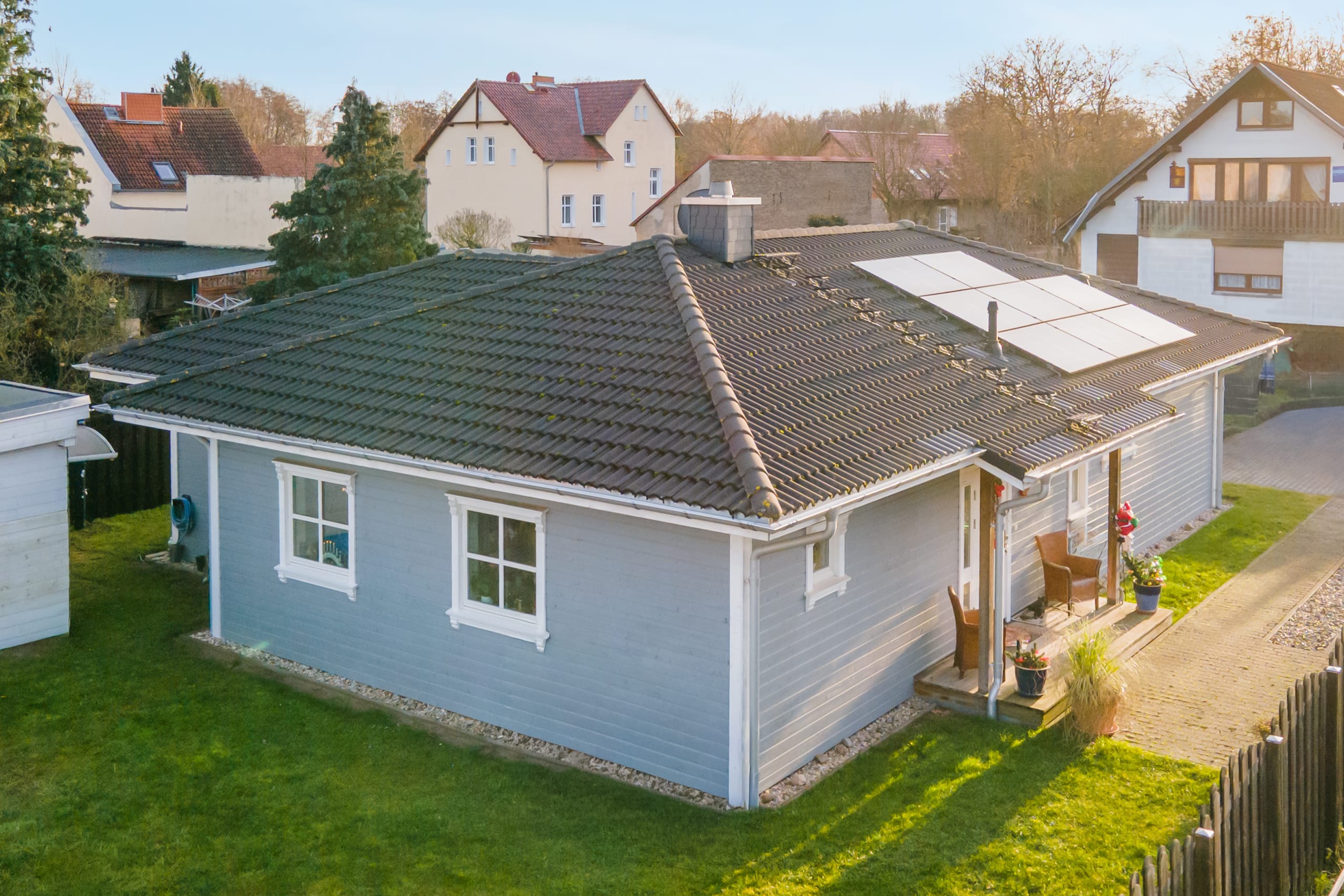 Freuen Sie sich auf modernes, gemütliches, bahnhofsnahes und echt skandinavisches Wohnen in zweiter Reihe zur Straße! Im Jahr 2016 von der beliebten Baufirma AKOST in typischer Holzständerbauweise errichtet, ist der ebenerdige Winkelbungalow das ideale Zuhause für kleine Familien und Senioren! Mit vier Zimmer, einem Bad, einem zur Küche geöffneten riesigen Wohnbereich und einer wundervollen Südost-Terrasse weiß der Bungalow auf ganzer Linie zu überzeugen.