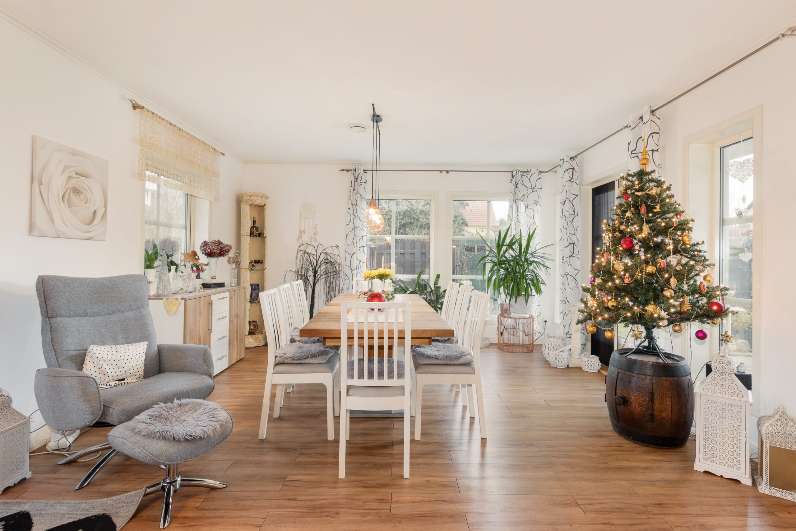 Der Wohnbereich verbindet sich harmonisch mit der offenen Wohnküche zu einem außergewöhnlich hellen und kommunikativen Mittelpunkt des Hauses. Besonders sehenswert ist der Seitenflügel im Wohnbereich mit Fenstern in drei Himmelsrichtungen und einem Ausgang zur wundervollen Terrasse mit Lichtspots und Markise. Highlights sind außerdem der freistehende Kamin und die umfassend ausgestattete Einbauküche.