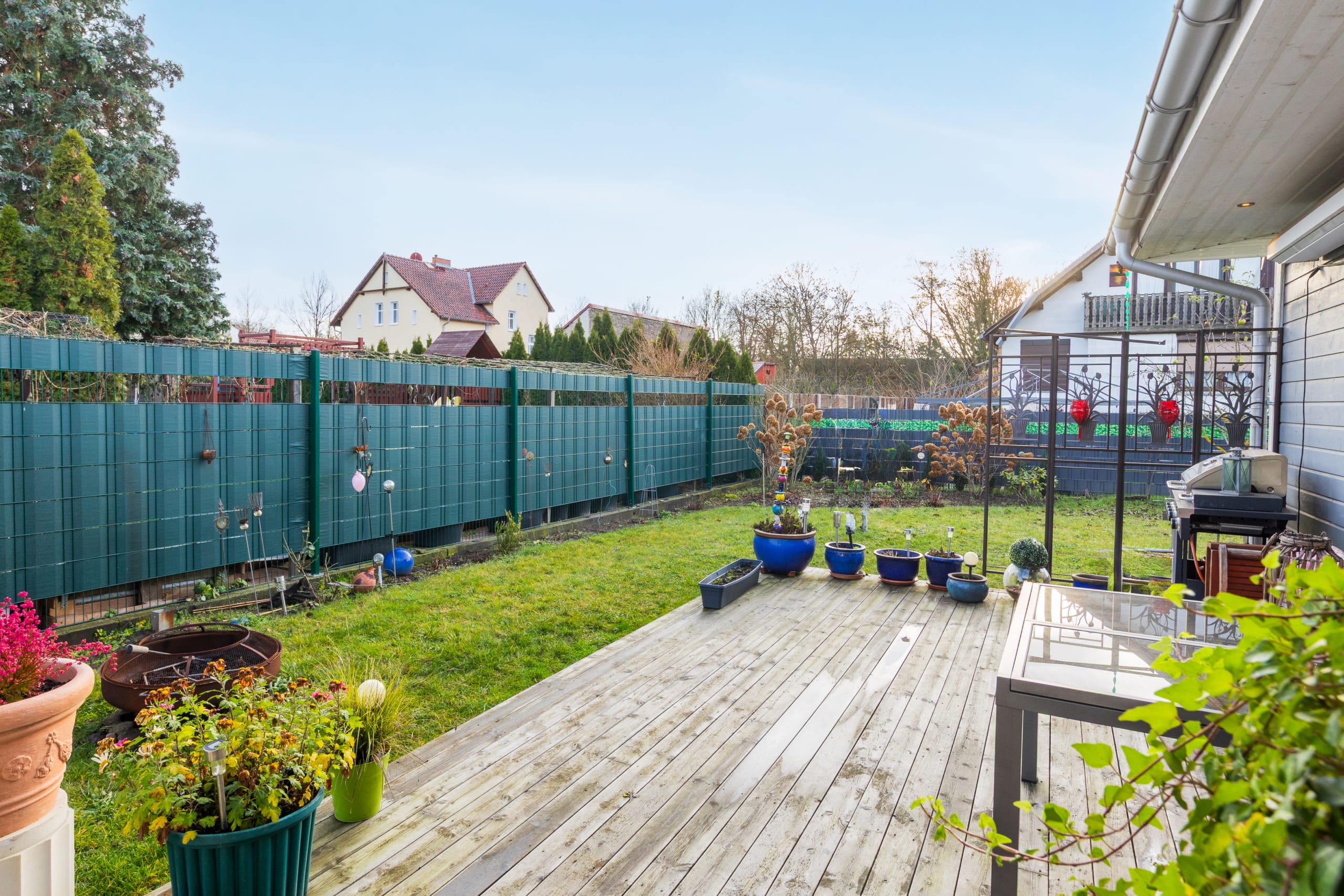 Im Außenbereich eröffnet sich Ihnen ein herrlich gepflegter und pflegeleichter Garten, der von allen Seiten umzäunt und vor Einblicken geschützt ist. Das skandinavische i-Tüpfelchen setzt die, wie sollte es anders sein, finnische Sauna im Gartenhaus.