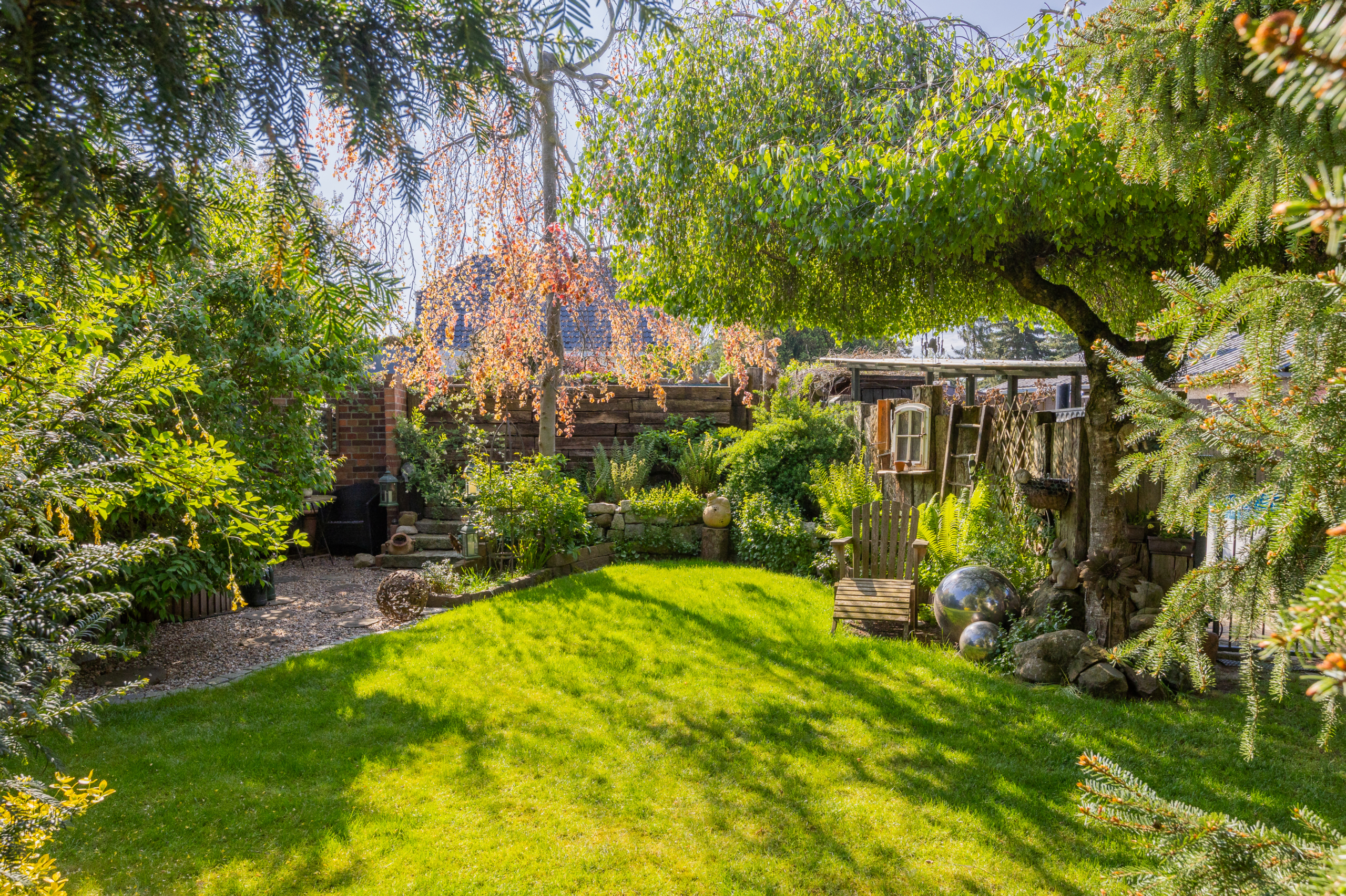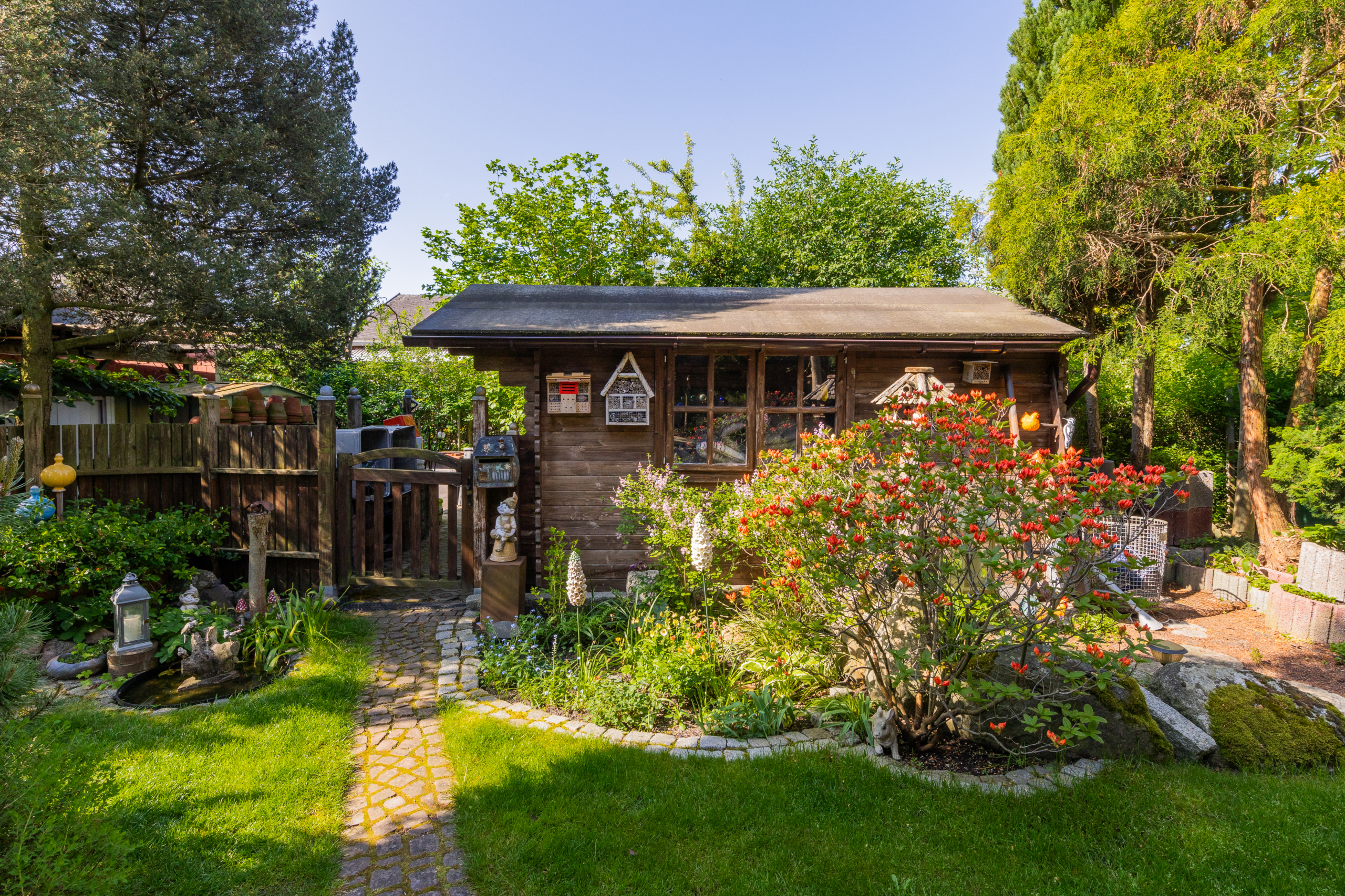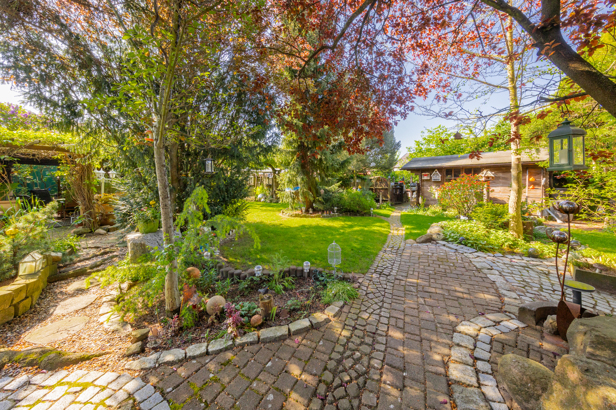 Der märchenhafte Garten schafft eine einzigartige Wohlfühlatmosphäre. Hecken und Bäume sorgen für viel Privatsphäre. Mehrere liebevoll angelegte Sitzbereiche laden zum Verweilen und Träumen ein. Zwei Gartenteiche sorgen für Entspannung pur. Praktisch! Verschiedene Gartenhäuser und eine Garage bieten Platz für Ihre Ordnung. Der Pool sorgt für Abkühlung an heißen Sommertagen.
