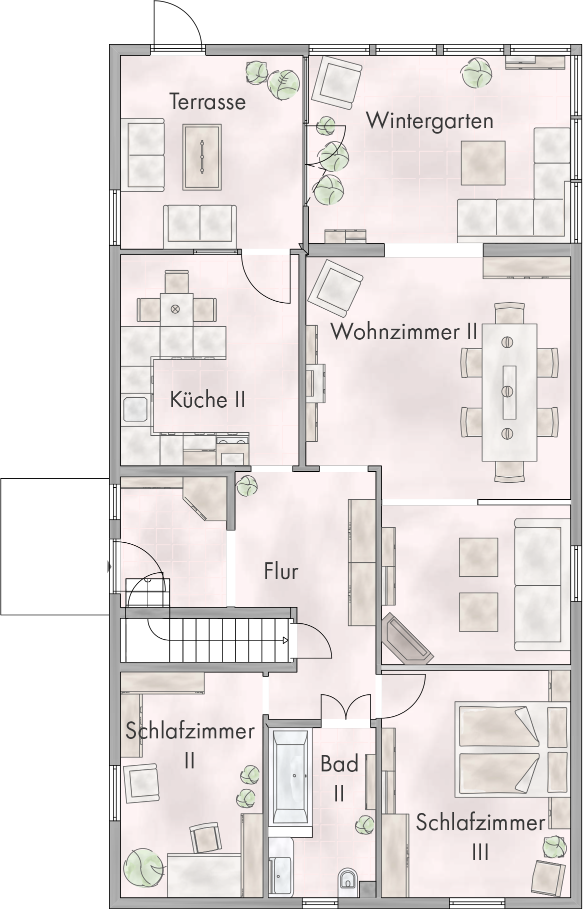 Das Wohnzimmer im Hochparterre zeigt sich lichtdurchflutet und freundlich. Der direkt an das Wohnzimmer angrenzende Wintergarten sorgt für einen herrlichen Blick in Ihren zauberhaft grünen Garten. Auch von der Hochterrasse aus, die von der Küche betreten wird, genießen Sie das satte Grün Ihres Grundstücks.