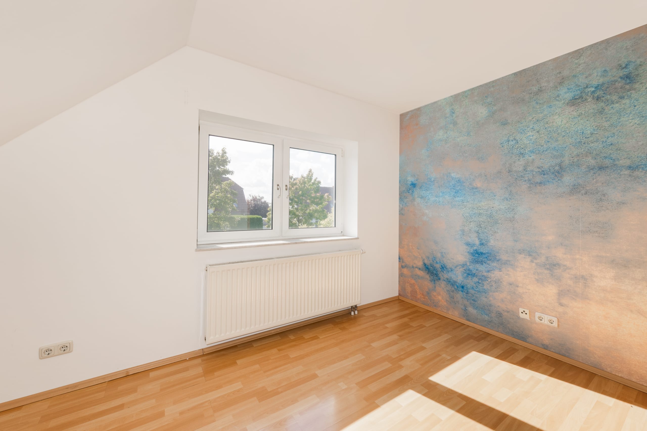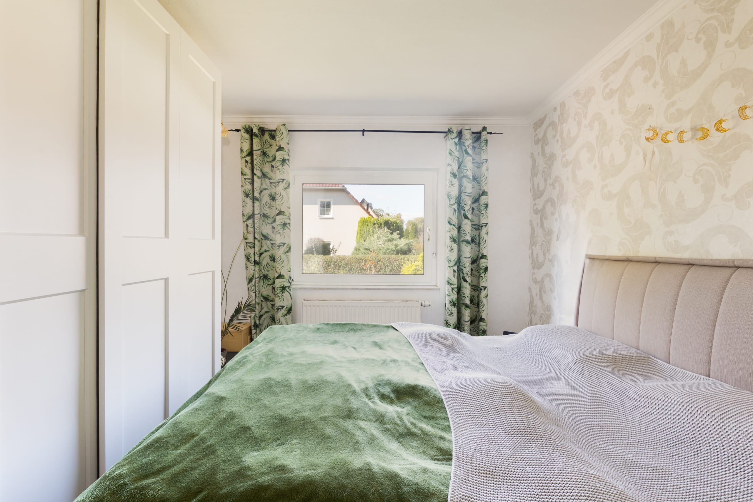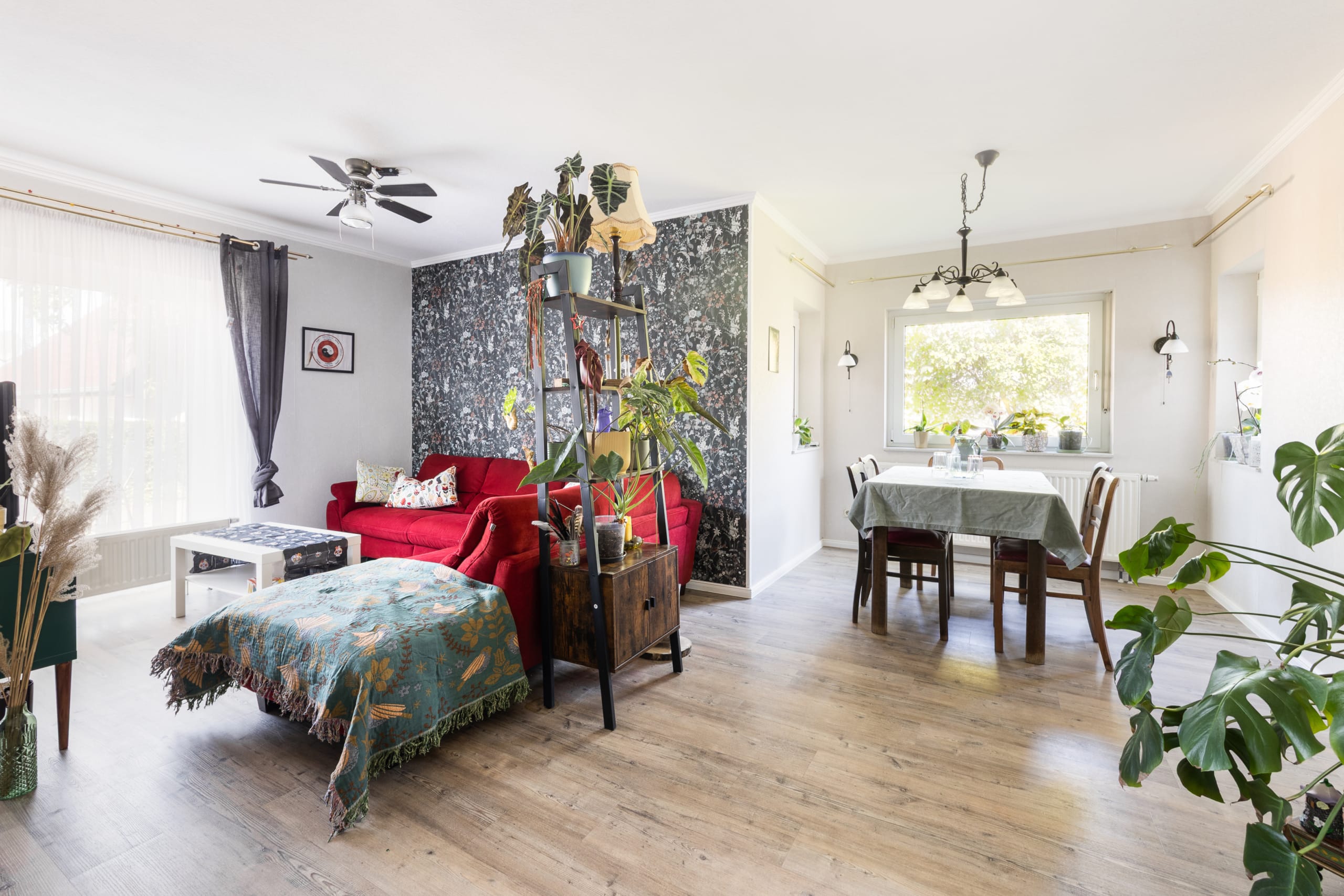 Insbesondere die großen Wohn-/Esszimmer bieten eine gemütliche Wohnatmosphäre und zeigen sich durch große Fenster sehr hell und freundlich. Im Erdgeschoss verfügt das Wohnzimmer außerdem über einen Erker. Die zahlreichen Fenster des Hauses schaffen eine enge Verbindung zum Garten. Eine Tür führt vom Wohnzimmer aus direkt auf die Terrasse. Auch im Obergeschoss betreten Sie den Balkon vom Wohnzimmer aus und blicken auf Ihren Garten und in die Weite der Natur.
