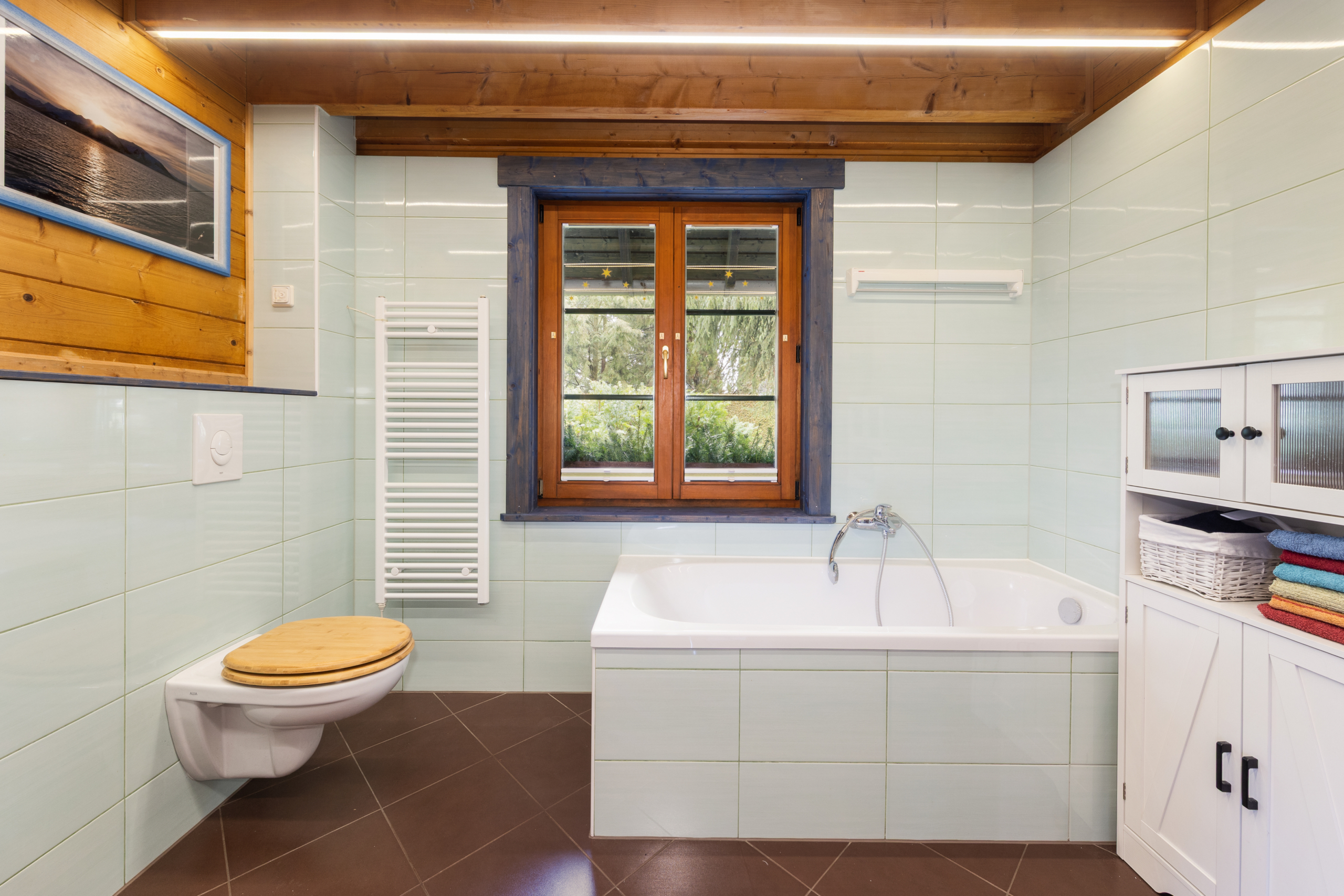 • Wandhoch gefliestes Tageslicht-Badezimmer (2012) im EG mit Dusche, Badewanne, Waschtisch, Handtuchheizkörper und WC