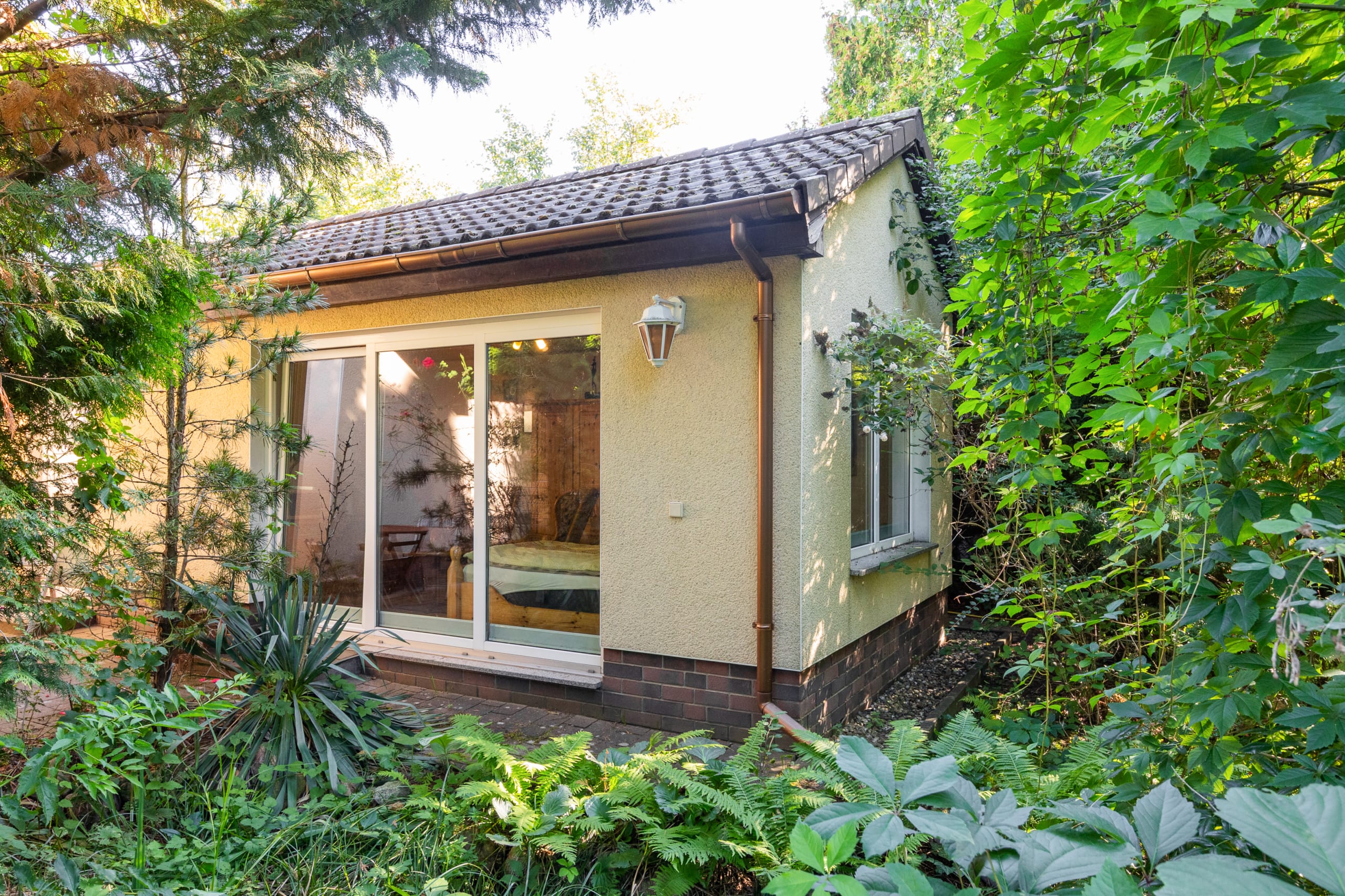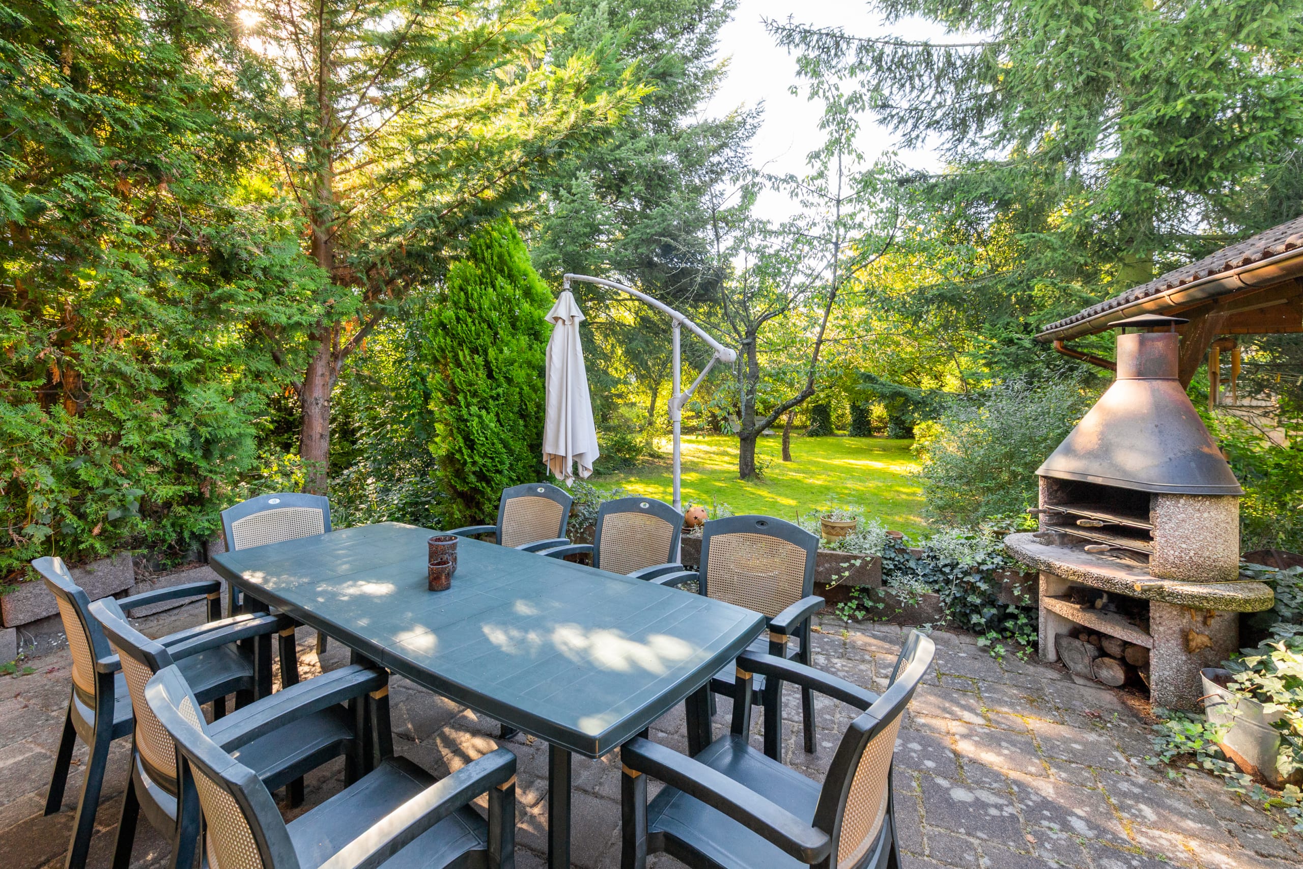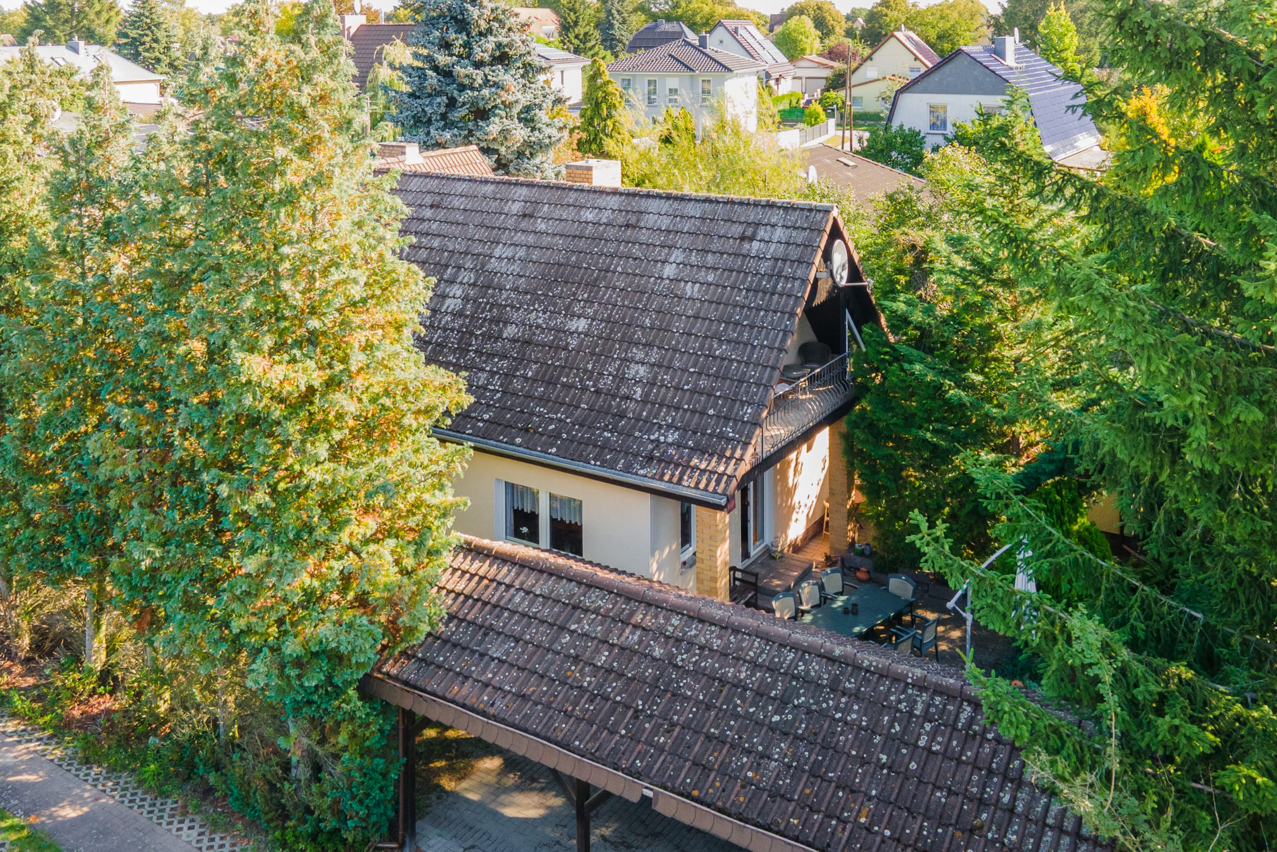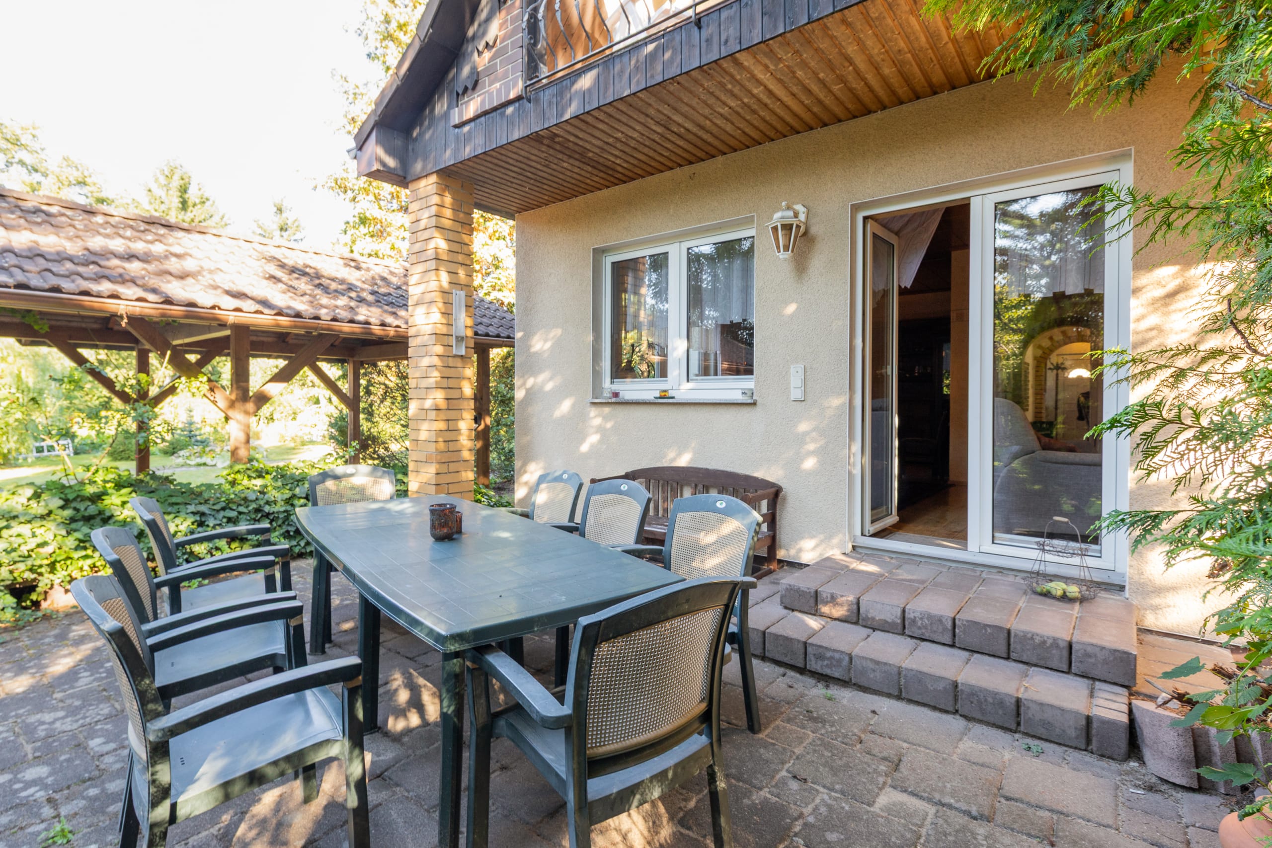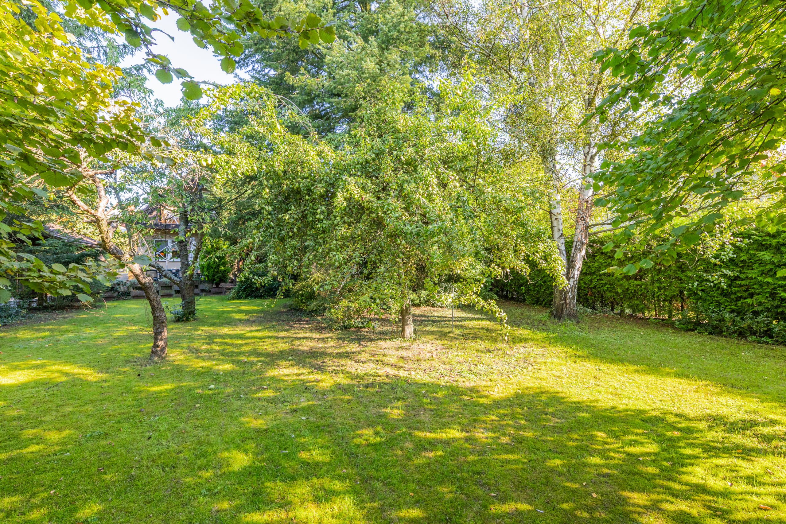 Auch der Garten rund um das Haus zeigt sich gut ausgestattet. Ein große und vor Einblicken geschützte Südterrasse lädt ebenso zur Entspannung ein wie die weitläufige und von Hecken, Sträuchern und Bäumen flankierte Rasenfläche. Platz für Ihre Fahrzeuge bietet der große Carport. Gäste, ein Büro oder ein Familienmitglied bringen Sie in der Remise unter, die über ein Wohn- und Schlafzimmer, ein Bad und eine Küchenzeile verfügt. Das Grundstück kann im hinteren Teil voraussichtlich mit einem weiteren Wohnhaus bebaut werden.