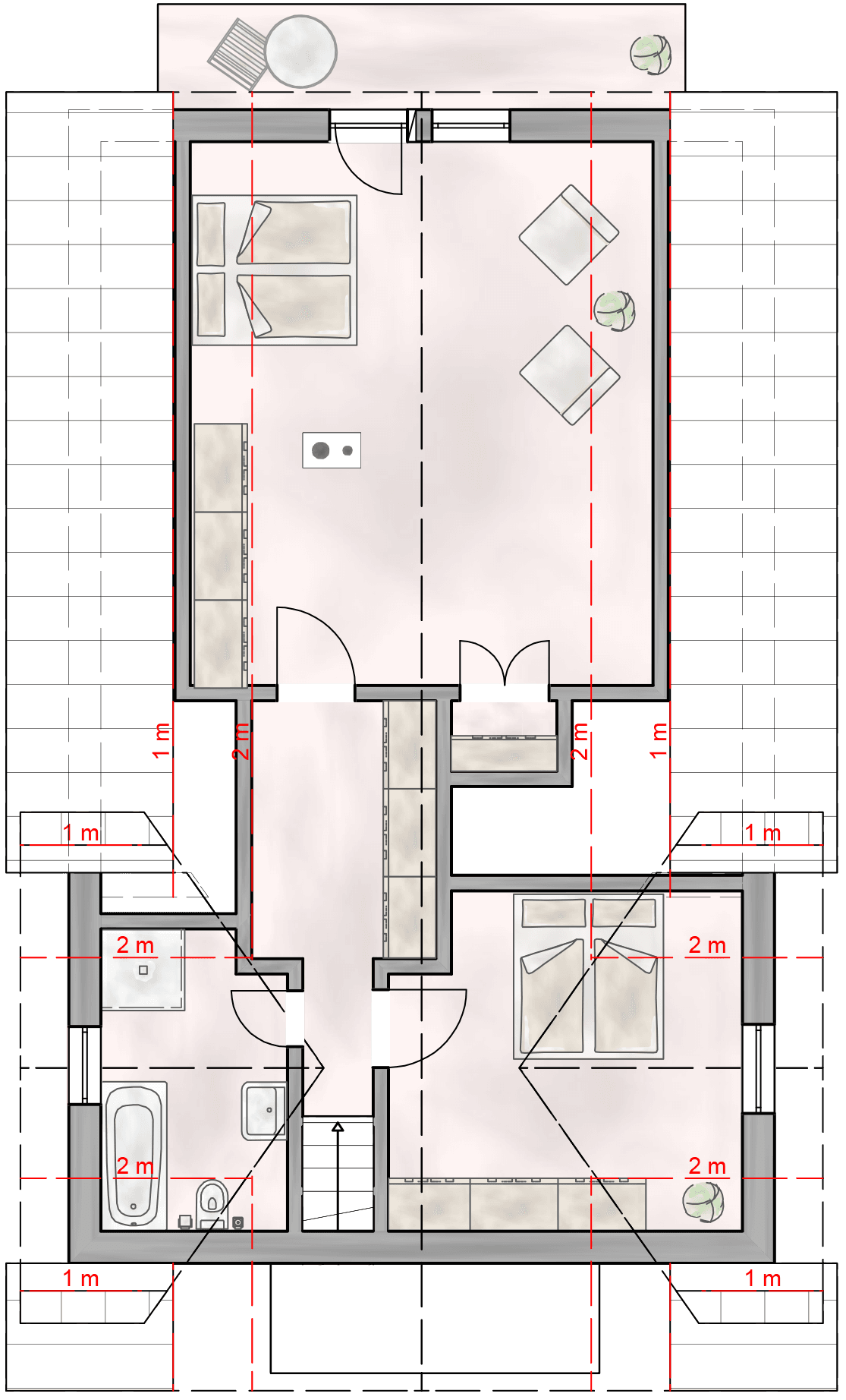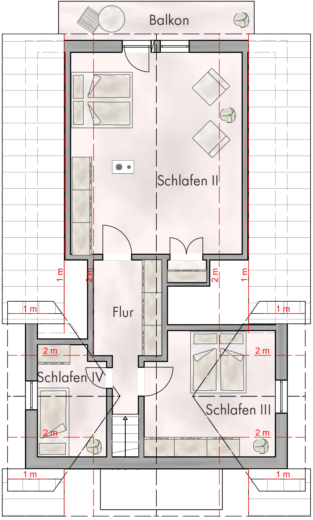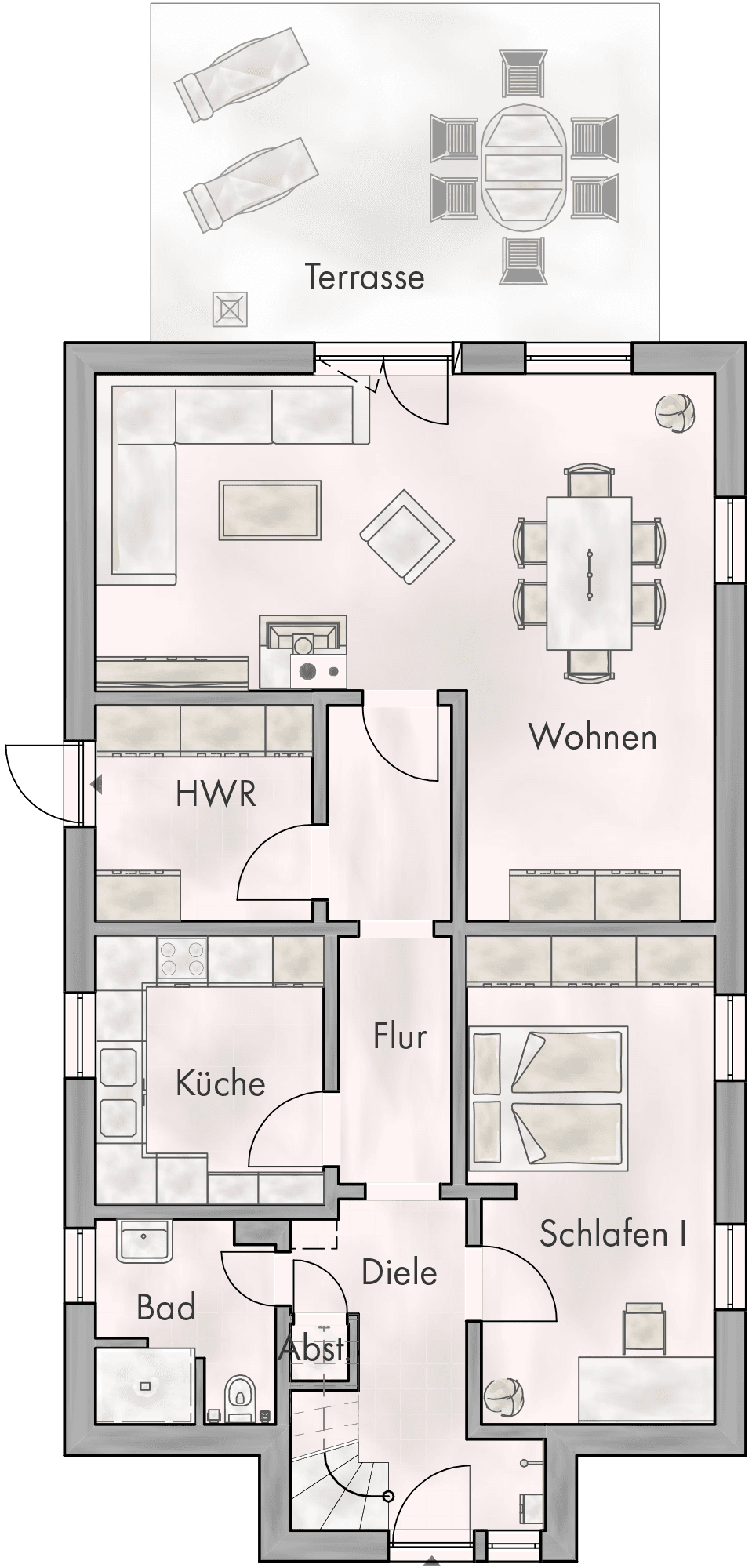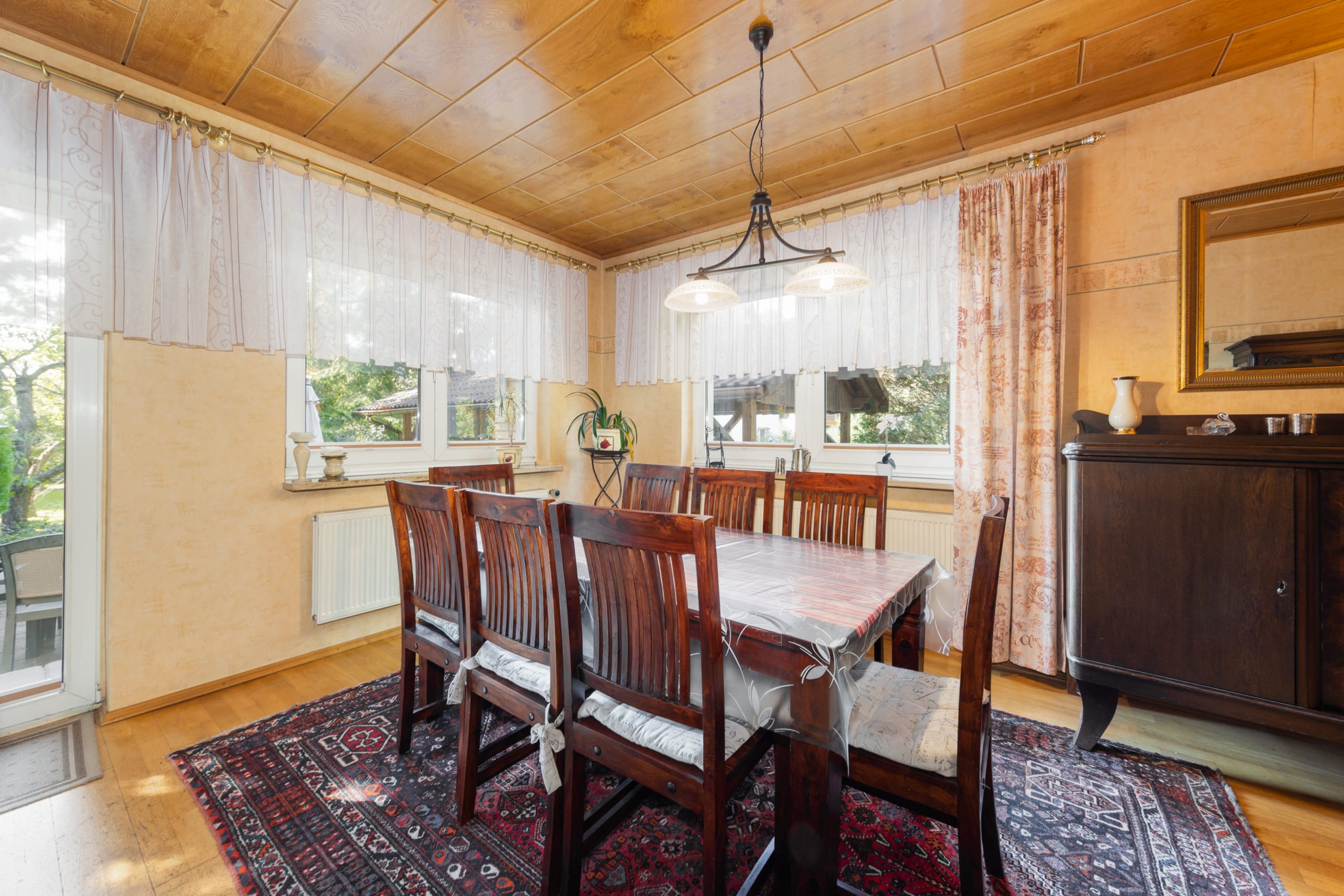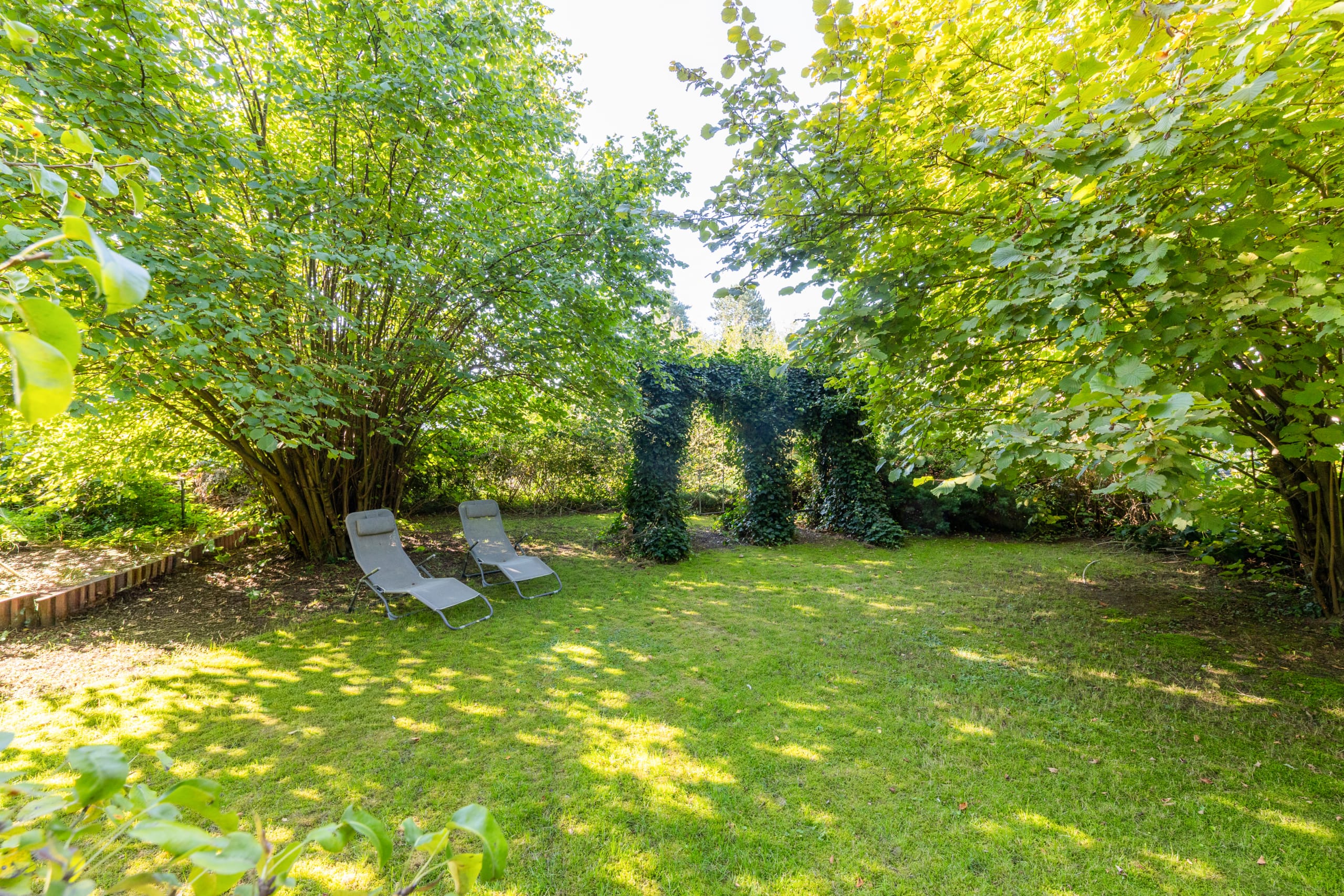 Auch der Garten rund um das Haus zeigt sich gut ausgestattet. Ein große und vor Einblicken geschützte Südterrasse lädt ebenso zur Entspannung ein wie die weitläufige und von Hecken, Sträuchern und Bäumen flankierte Rasenfläche. Platz für Ihre Fahrzeuge bietet der große Carport. Gäste, ein Büro oder ein Familienmitglied bringen Sie in der Remise unter, die über ein Wohn- und Schlafzimmer, ein Bad und eine Küchenzeile verfügt. Das Grundstück kann im hinteren Teil voraussichtlich mit einem weiteren Wohnhaus bebaut werden.
