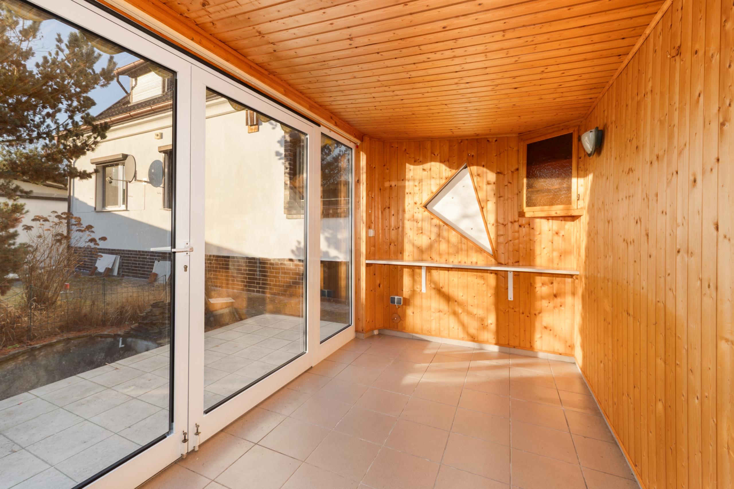 Im Außenbereich erwartet Sie viel Stauraum: Eine Doppelgarage bietet Stellfläche für zwei Fahrzeuge, ergänzt durch zusätzliche Abstellräume und einen Schuppen. Zum Entspannen gehen Sie auf die Terrasse vor dem separaten Wintergarten, von wo aus Sie den Blick in Richtung Abendsonne und auf einen kleinen Teich genießen.