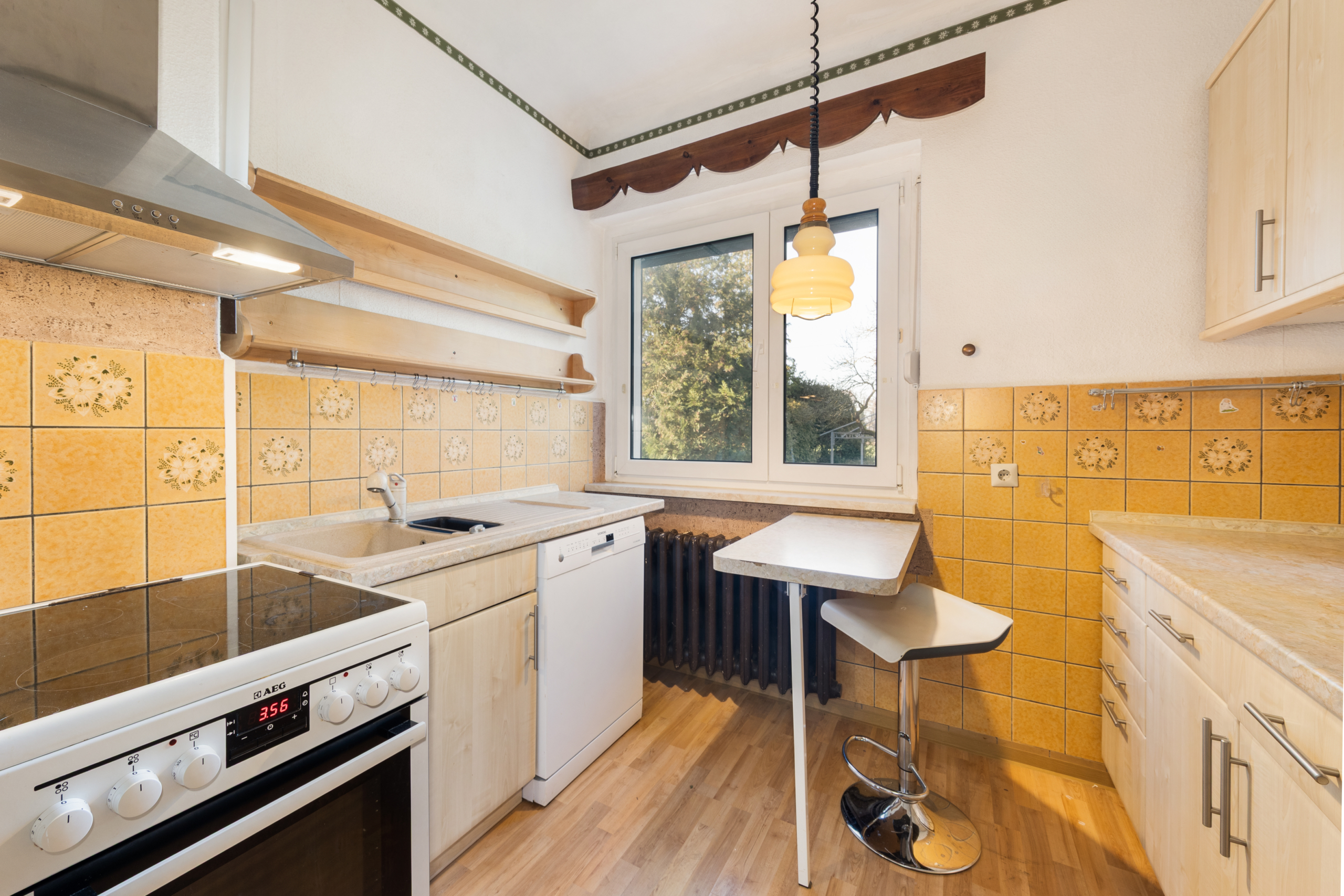 Besonders hervorzuheben sind die Holzbalken im Obergeschoss, der stilechte Dielenboden und die massive Holztreppe vom Erd- zum Obergeschoss, die mit überschaubarem Aufwand wieder in neuem Glanz erstrahlen kann. Die Gastherme wurde im Jahr 2022 erneuert. Das Tageslicht-Badezimmer ist klassisch ausgestattet und verfügt über eine Badewanne, ein Waschbecken und ein WC. Auch die Einbaumöbel in der vom Wohnbereich räumlich getrennten Küche zeigen sich eher funktional. Eine Waschküche finden Sie im Keller.