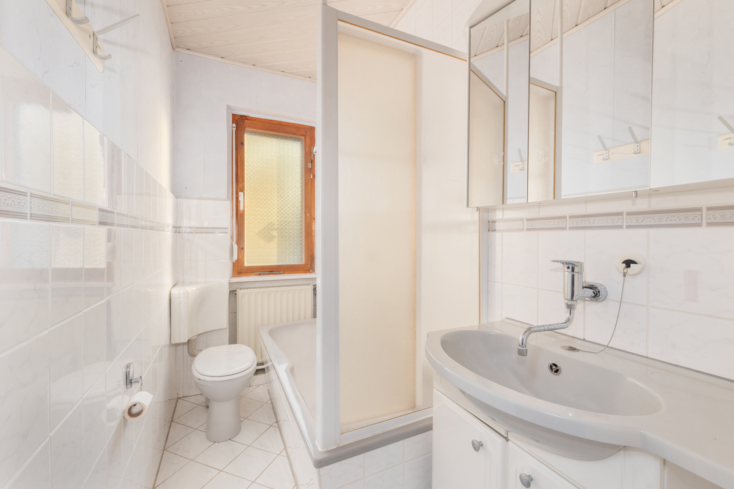• Wandhoch gefliestes Tageslicht-Badezimmer im EG mit Badewanne, Waschtisch und WC