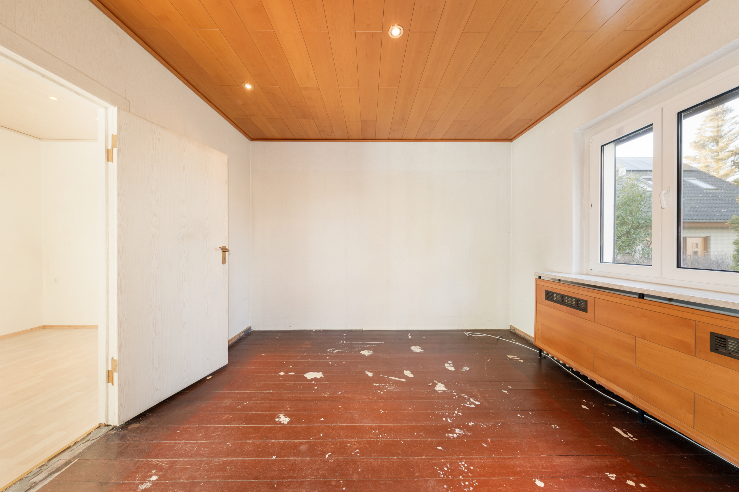 • Holzverkleidung an der Decke im Bad, Wohnen I und II