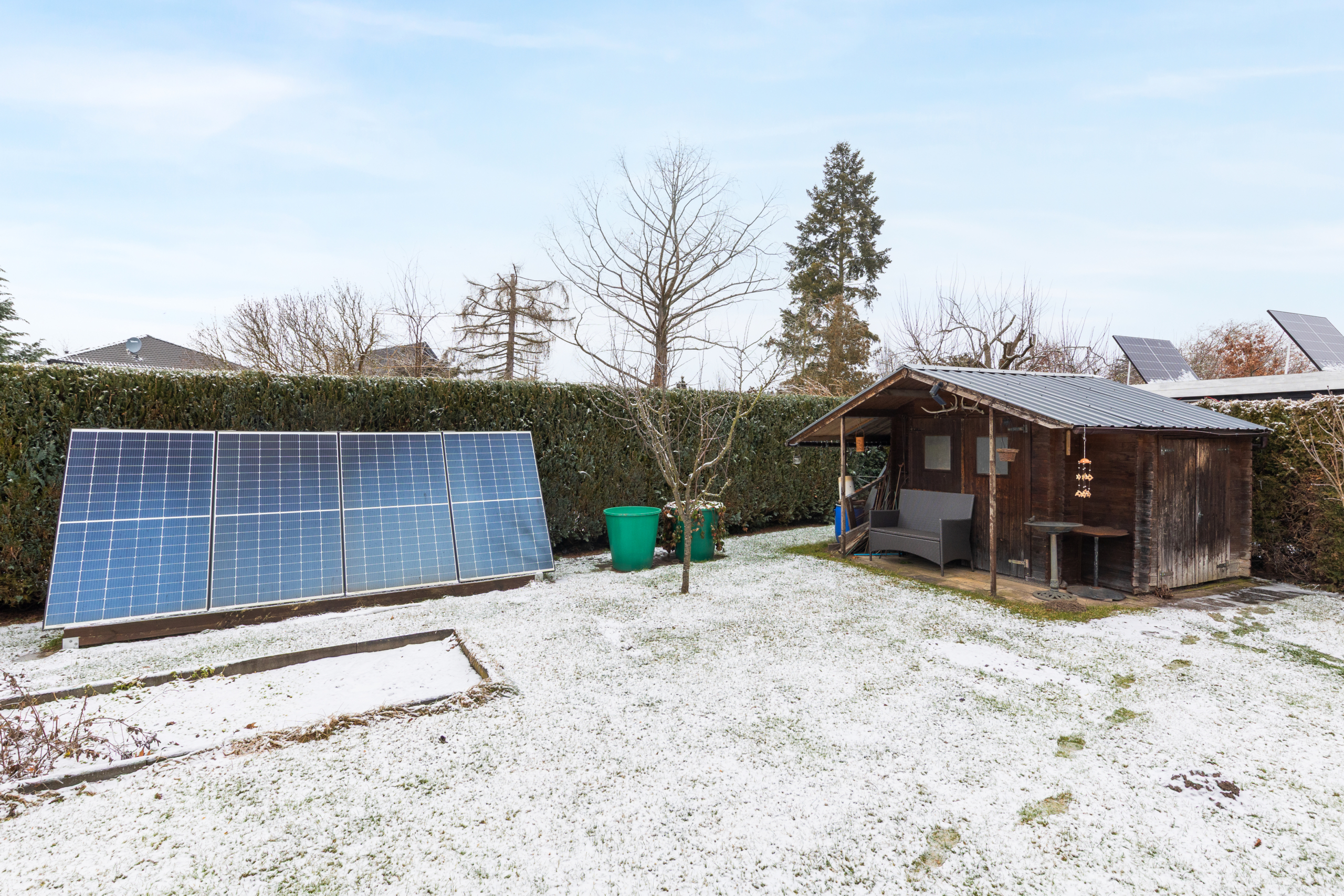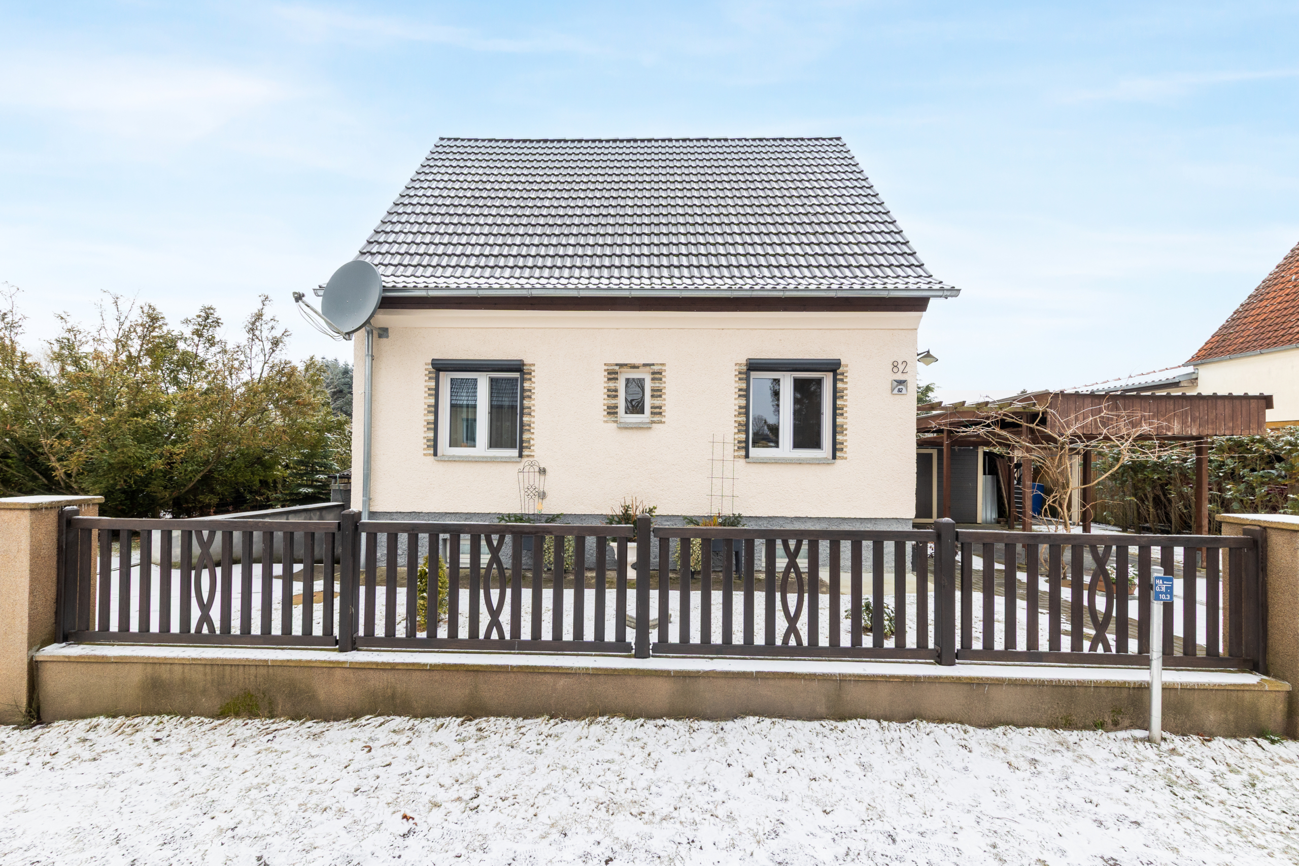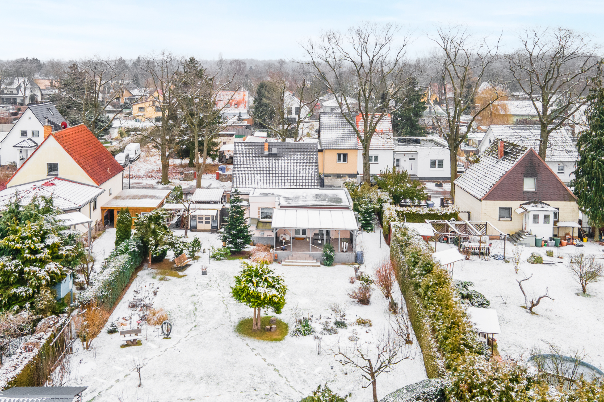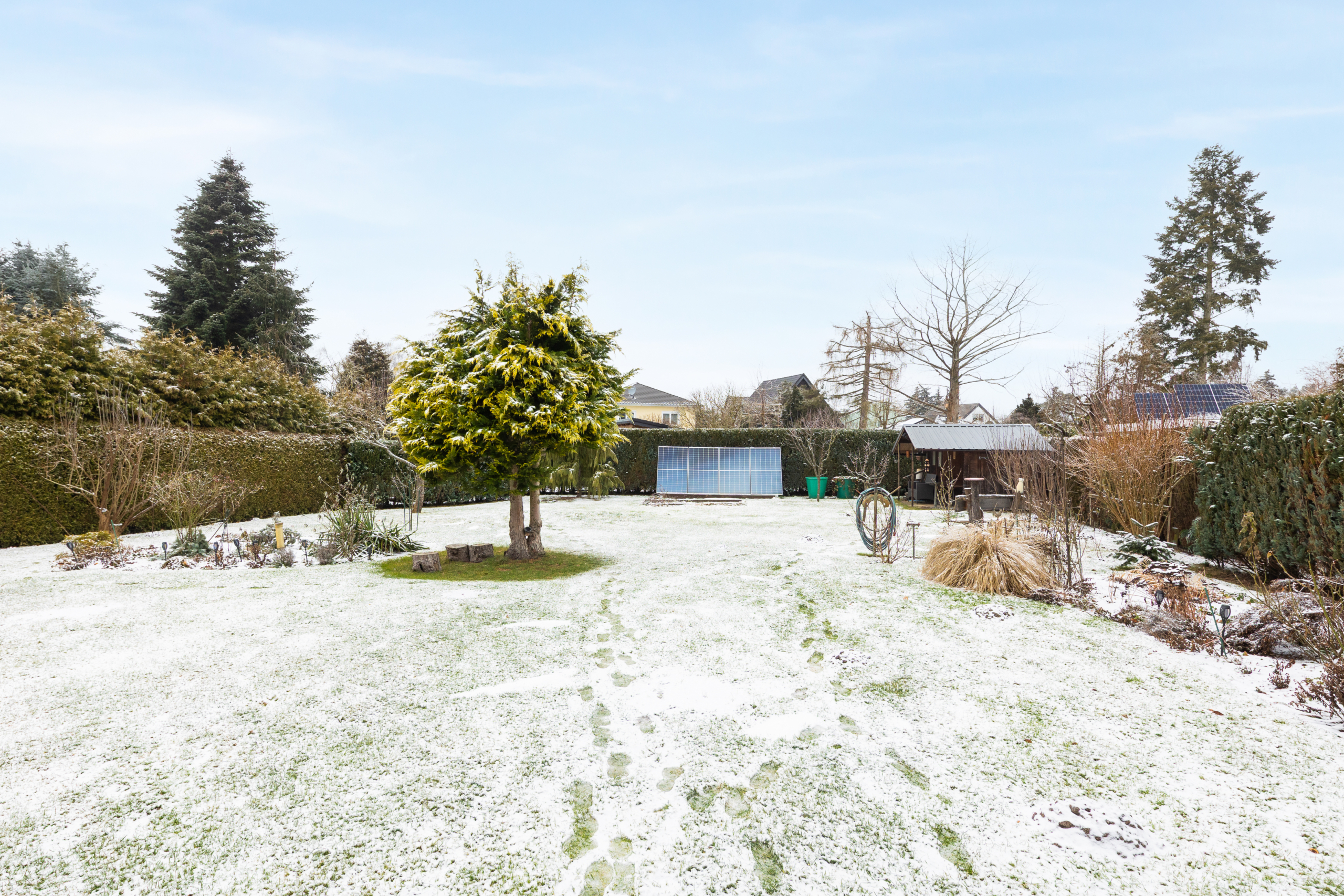 Im Garten erwarten Sie ein praktischer Carport ein Schuppen und eine Laube. Darüber hinaus ist Ihr großes Anwesen erholsam gestaltet: Im gepflegten Garten mit weiter Rasenfläche und überdachter Terrasse verbringen Sie täglich erholsame Zeit im Freien.