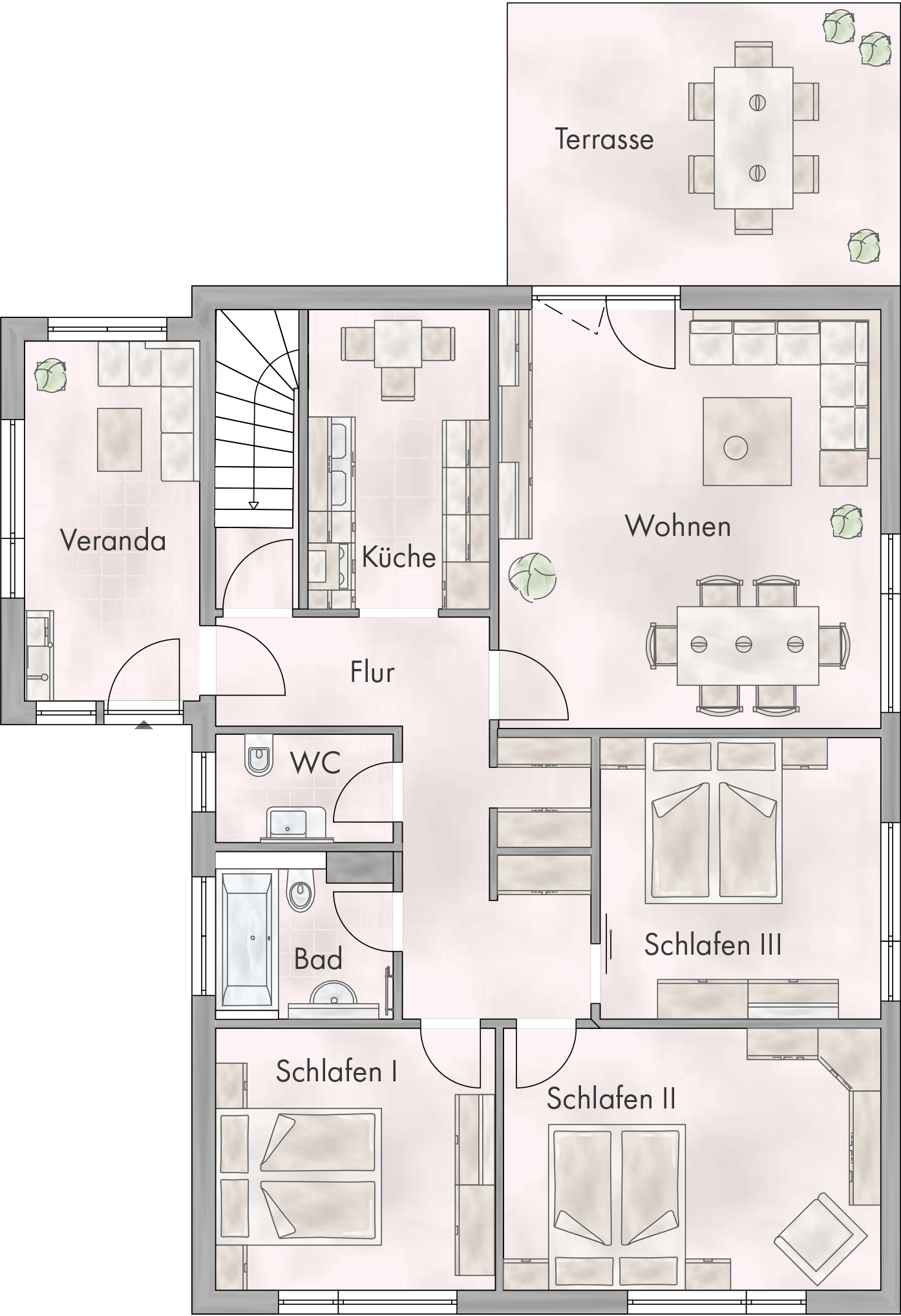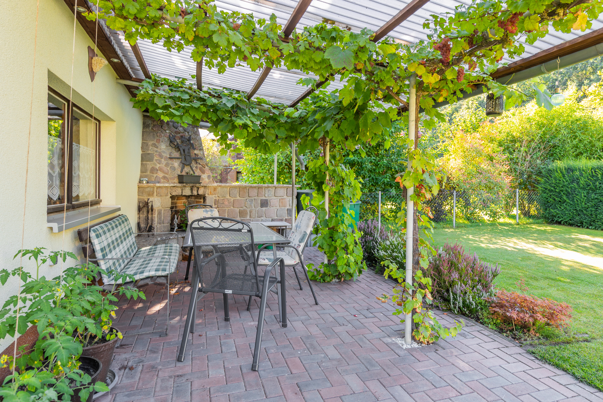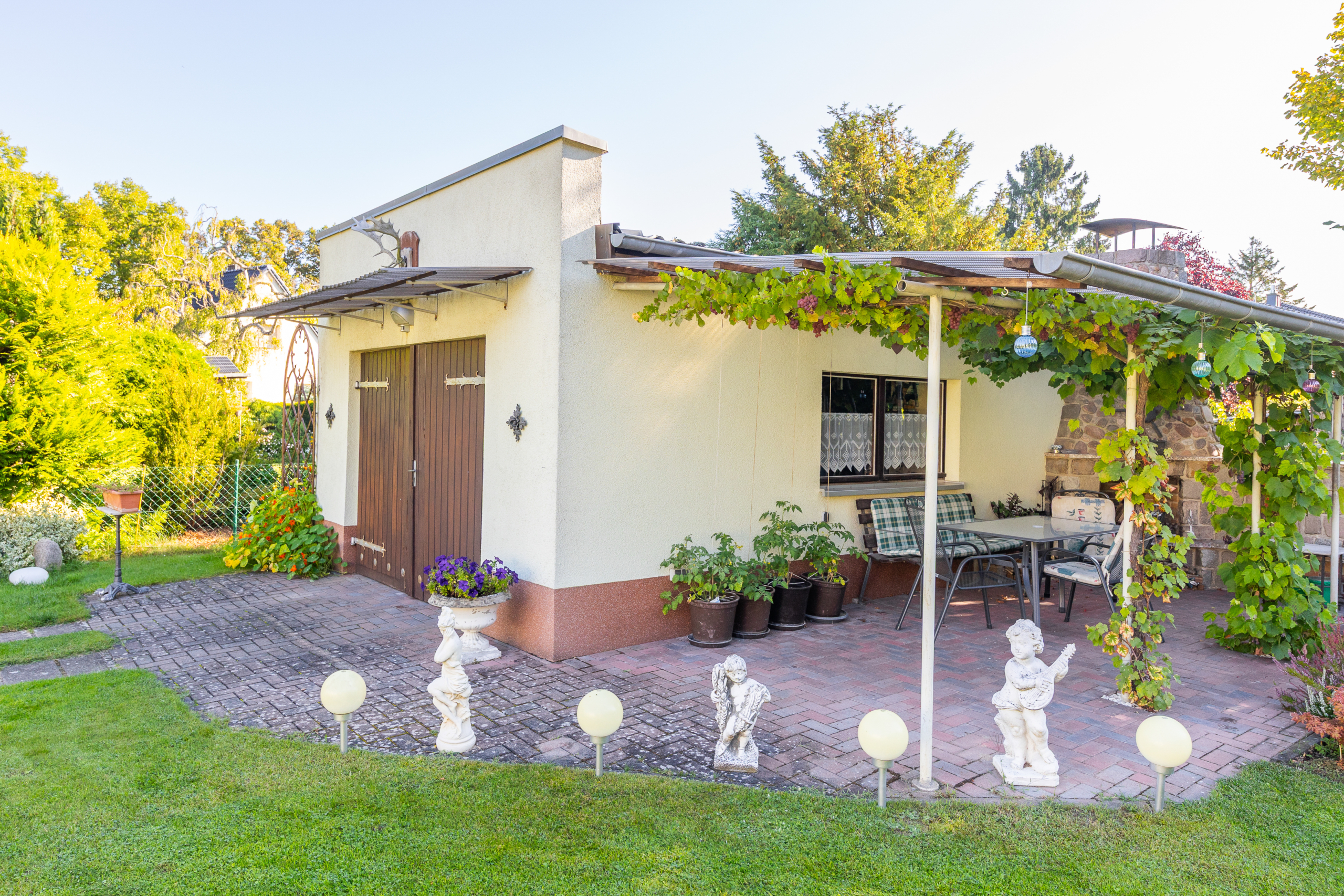 Rund um das Haus erwartet Sie ein angenehm großes, pflegeleicht angelegtes und vollständig umzäuntes Grundstück. Zwei Terrassen, eine Garage, eine weitläufige Rasenfläche und hohe Hecken sorgen für Ihren wohlverdienten Gartengenuss.