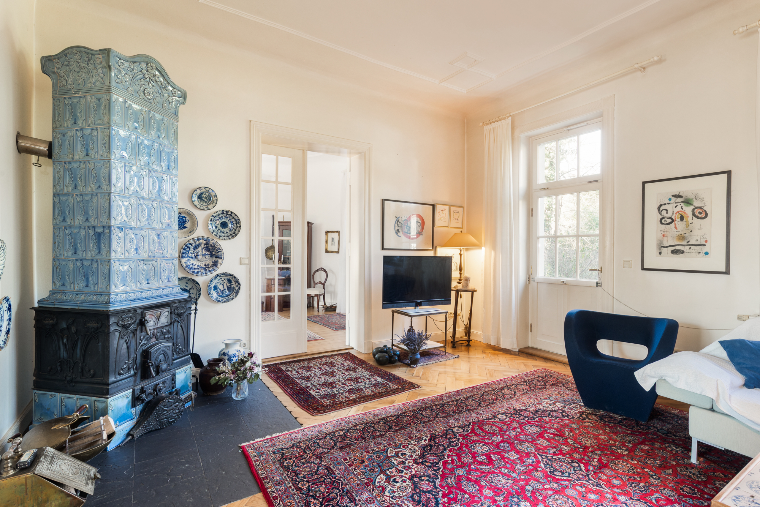 • Meißener Kachelofen aus dem Jahr 1920 im Wohnen I (im Jahr 2005 eingebaut)