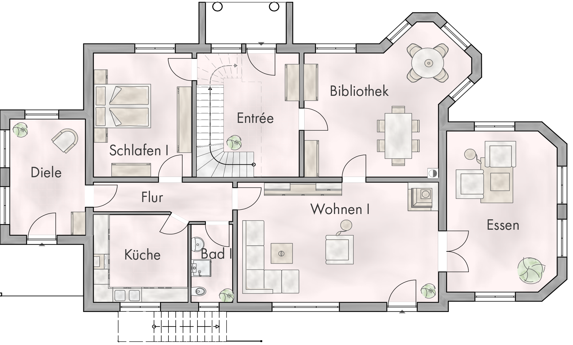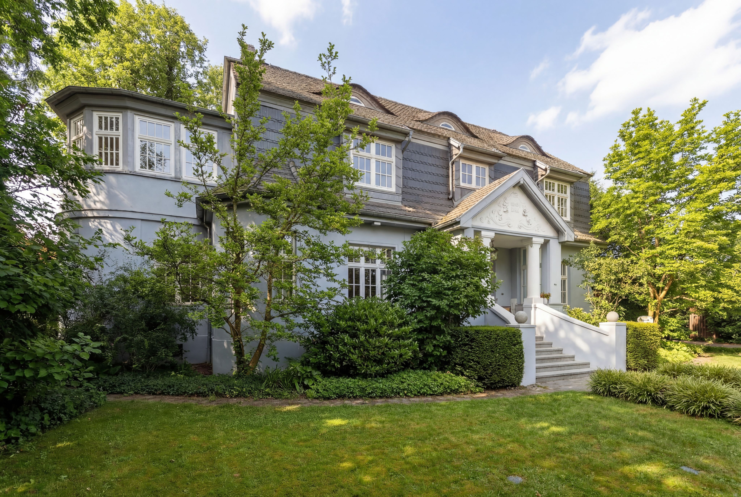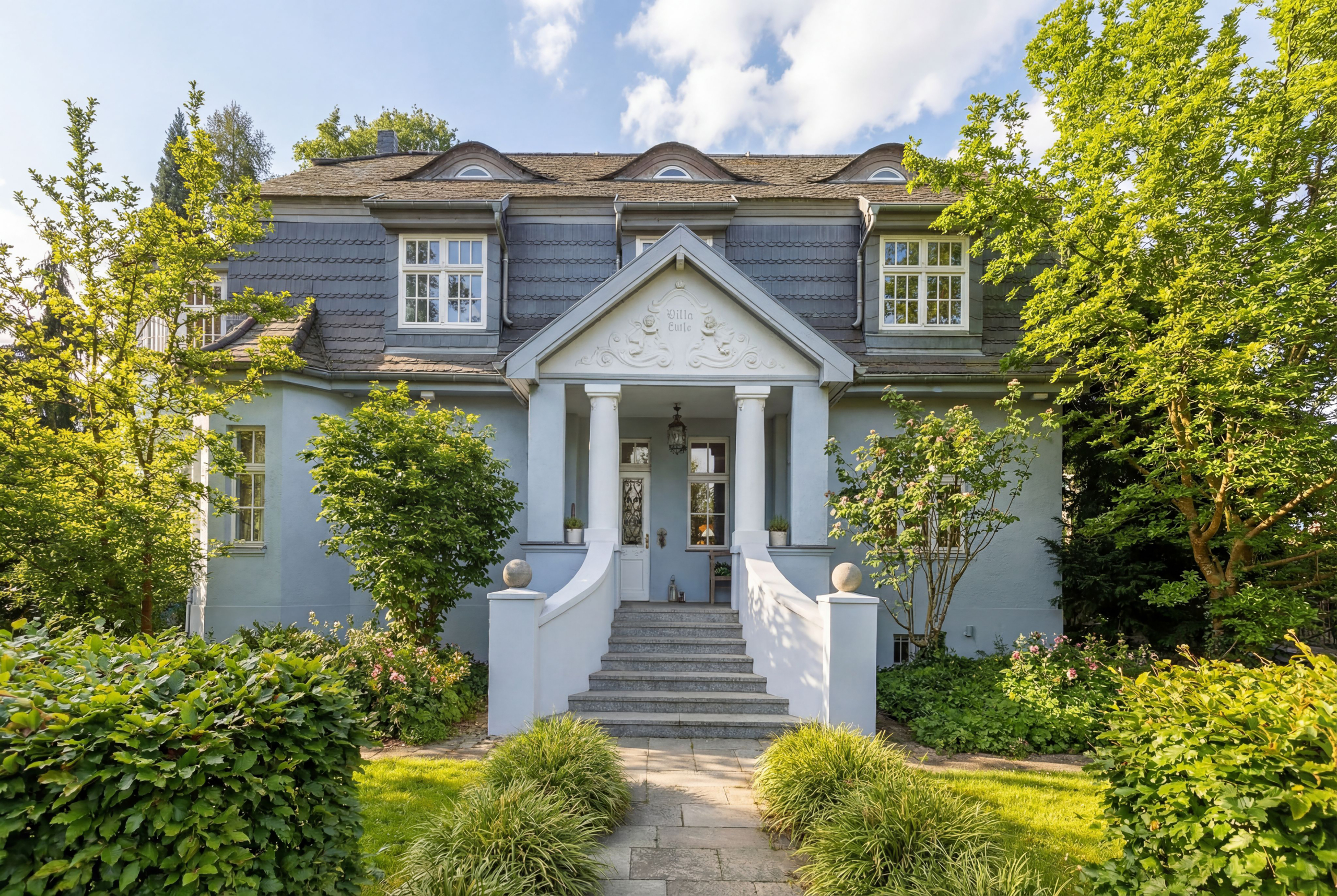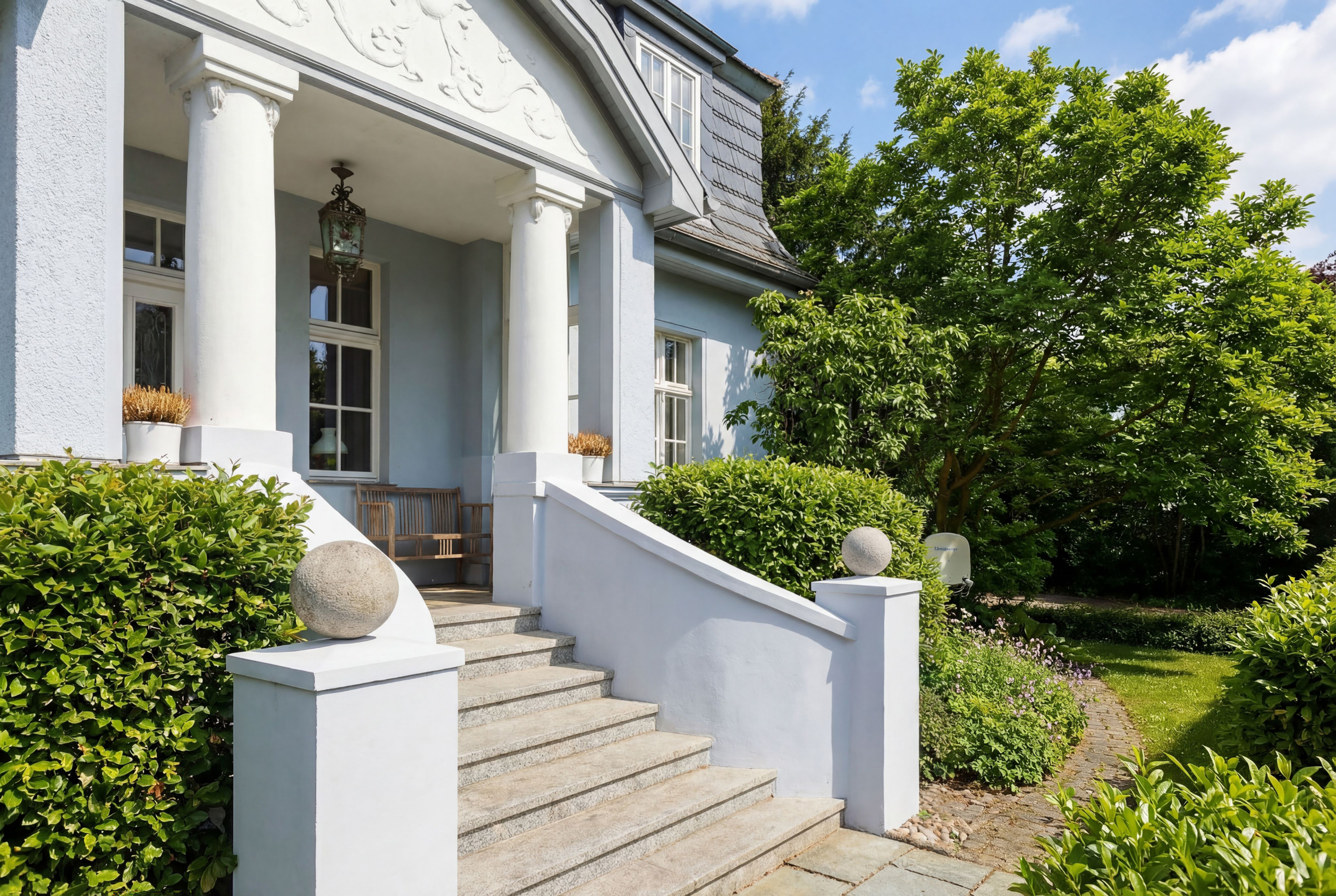 • Mondänes Eingangsportal mit Säulen, Satteldach mit verziertem Giebel, überdachtem Vorraum und Treppe