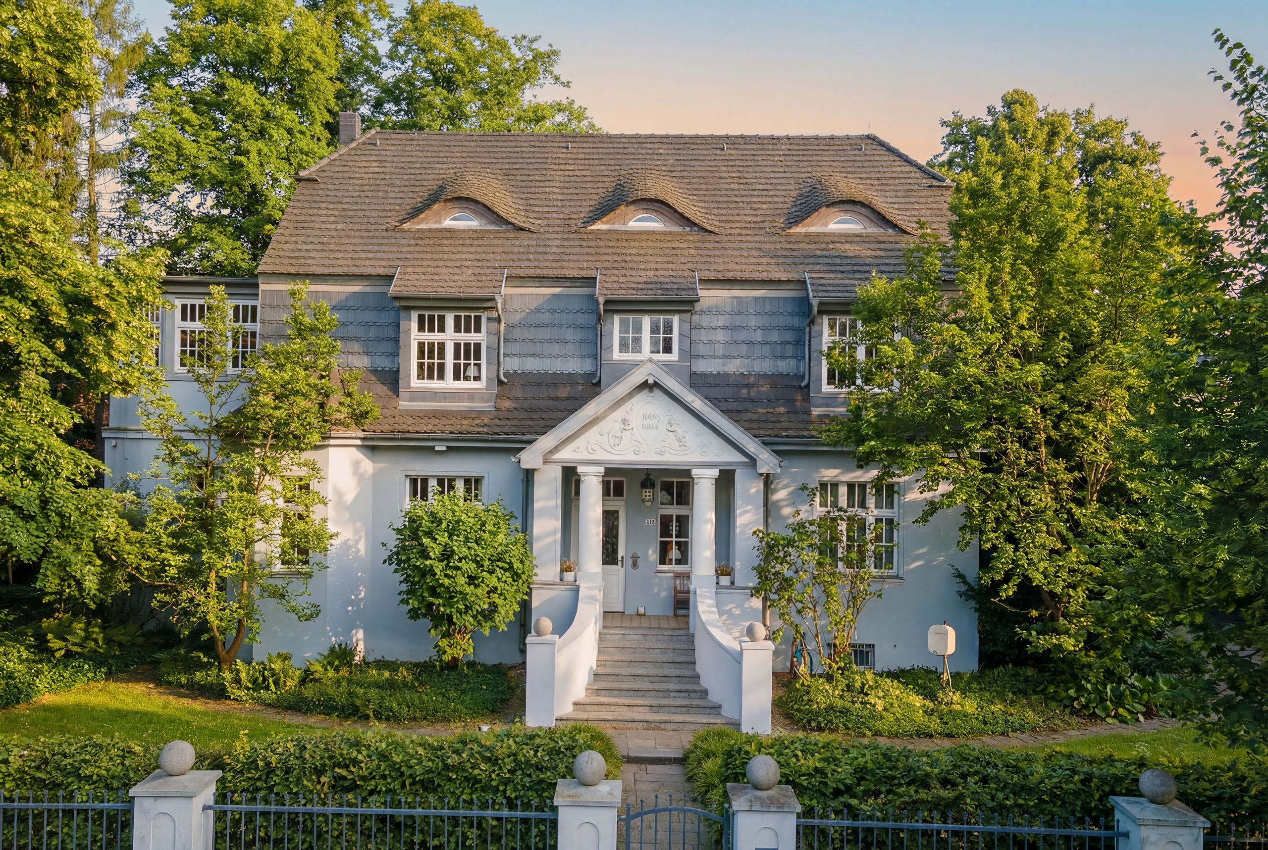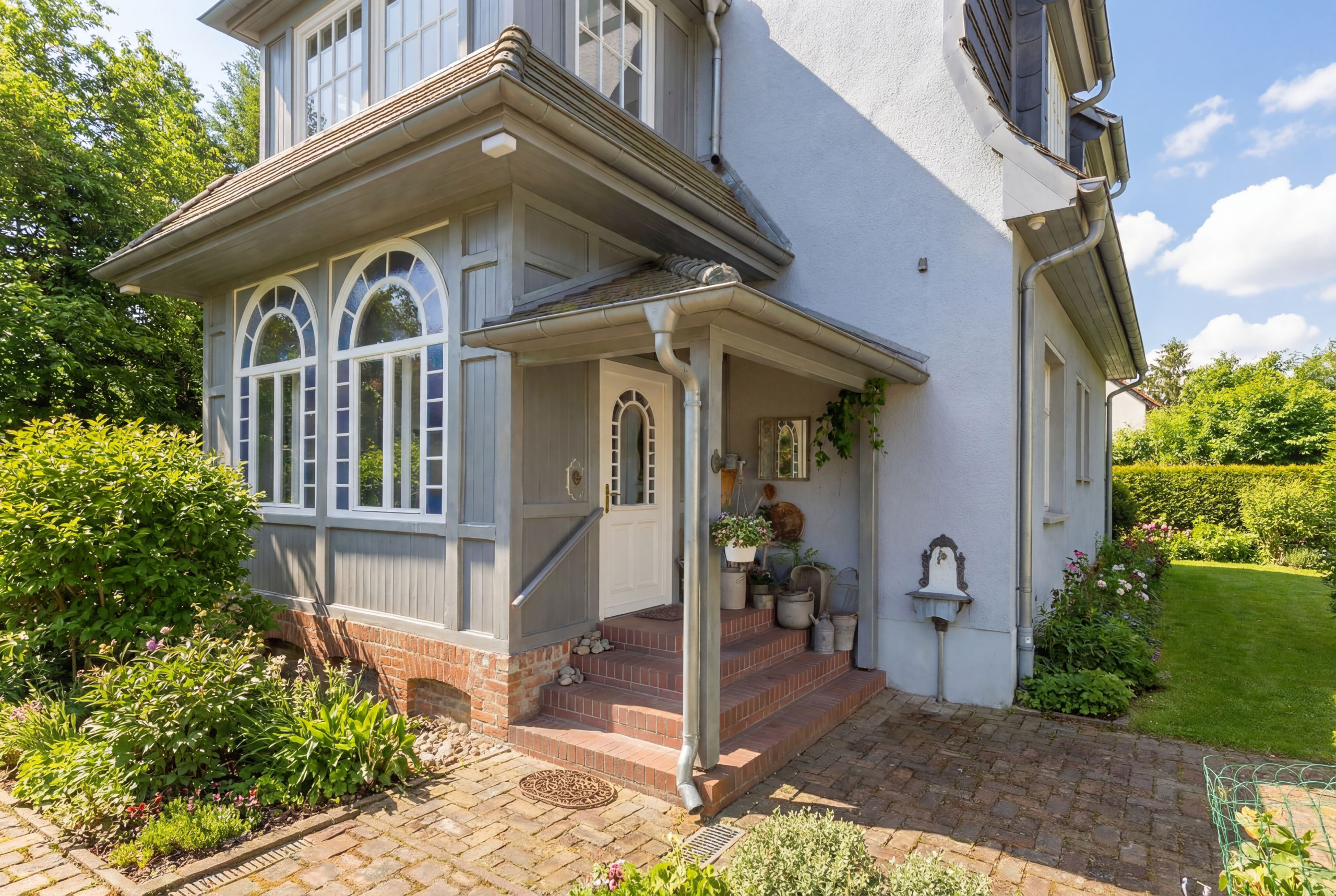 • Gartentor mit gepflastertem Weg zur eindrucksvollen Hauseingangstreppe