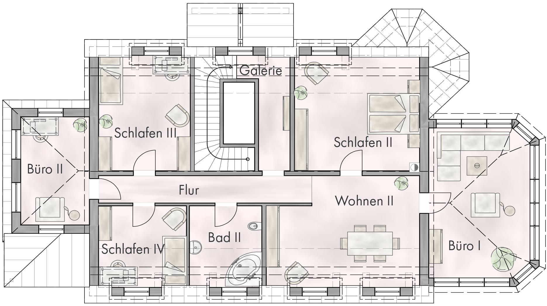 • Mansarddach mit Schleppgauben im OG und Fledermausgauben im DG