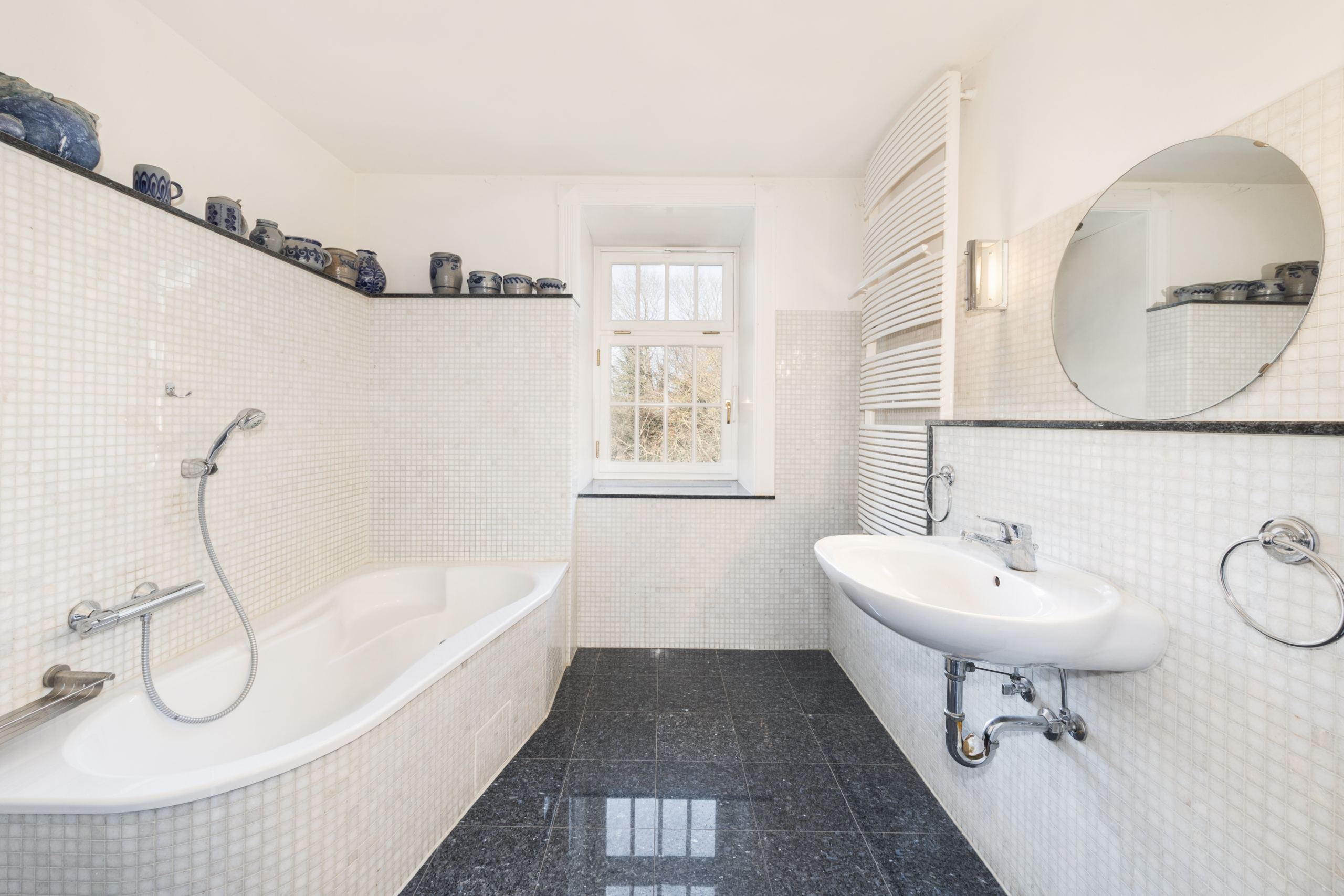 • Gefliestes Tageslicht-Badezimmer im OG mit Badewanne, Handtuchheizkörper, Waschtisch und WC