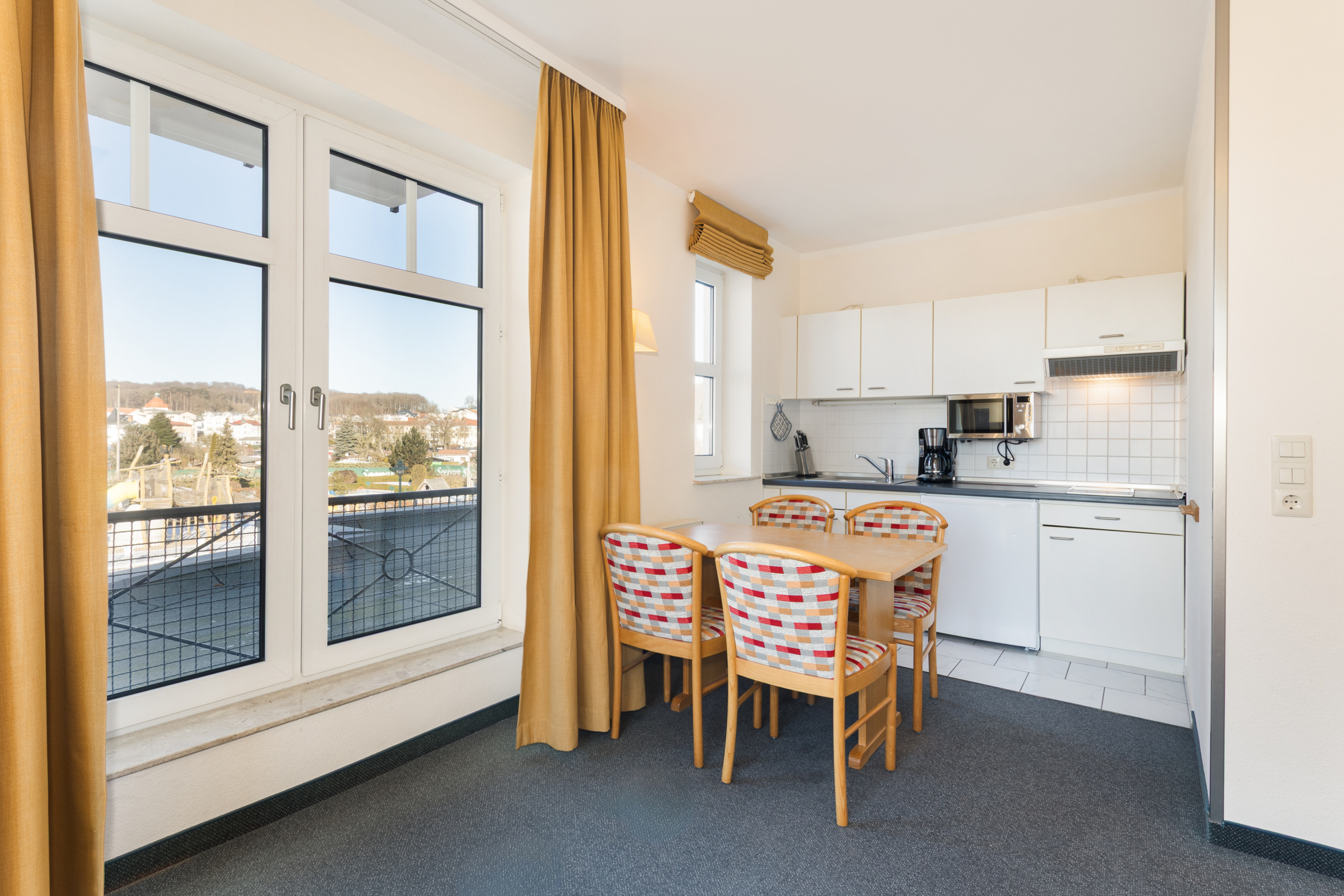 Die Wohnung in der ersten Etage eines Mehrfamilienhauses mit 24 Wohneinheiten erreicht man über einen Aufzug, nachdem man sein Fahrzeug auf dem wohnungseignen Stellplatz abgestellt haben. Die Wohnung selbst präsentiert sich als Eckwohnung und bietet Platz für zwei bis vier Feriengäste. Die (fast) bodentiefen Fenster im hellen und freundlichen Wohnbereich mit offener Küche sind nach Südwesten und Nordwesten ausgerichtet, so dass man hier insbesondere die Nachmittag- und Abendsonne genießt. Die etwas in die Jahre gekommene Küchenzeile ist mit einem Kochfeld, einer Mikrowelle, einer Dunstabzugshaube und einem Kühlschrank ausgestattet. Das große und mit einer Dusche, einem Waschtisch und einem WC ausgestattete Bad vervollständigt das Raumangebot.